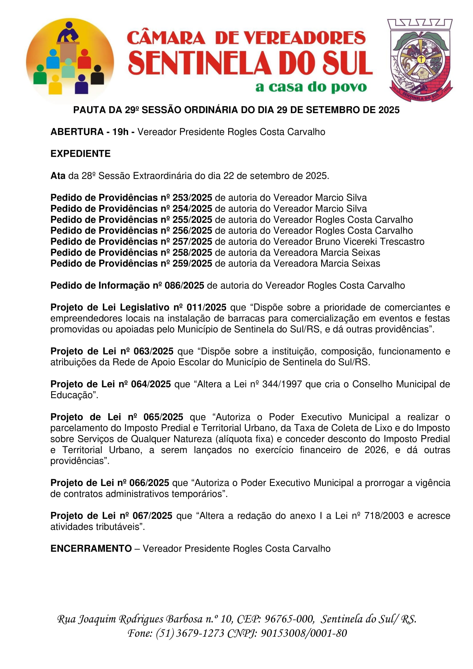 Pauta da 29º Sessão Ordinária do dia 29 de Setembro de 2025.