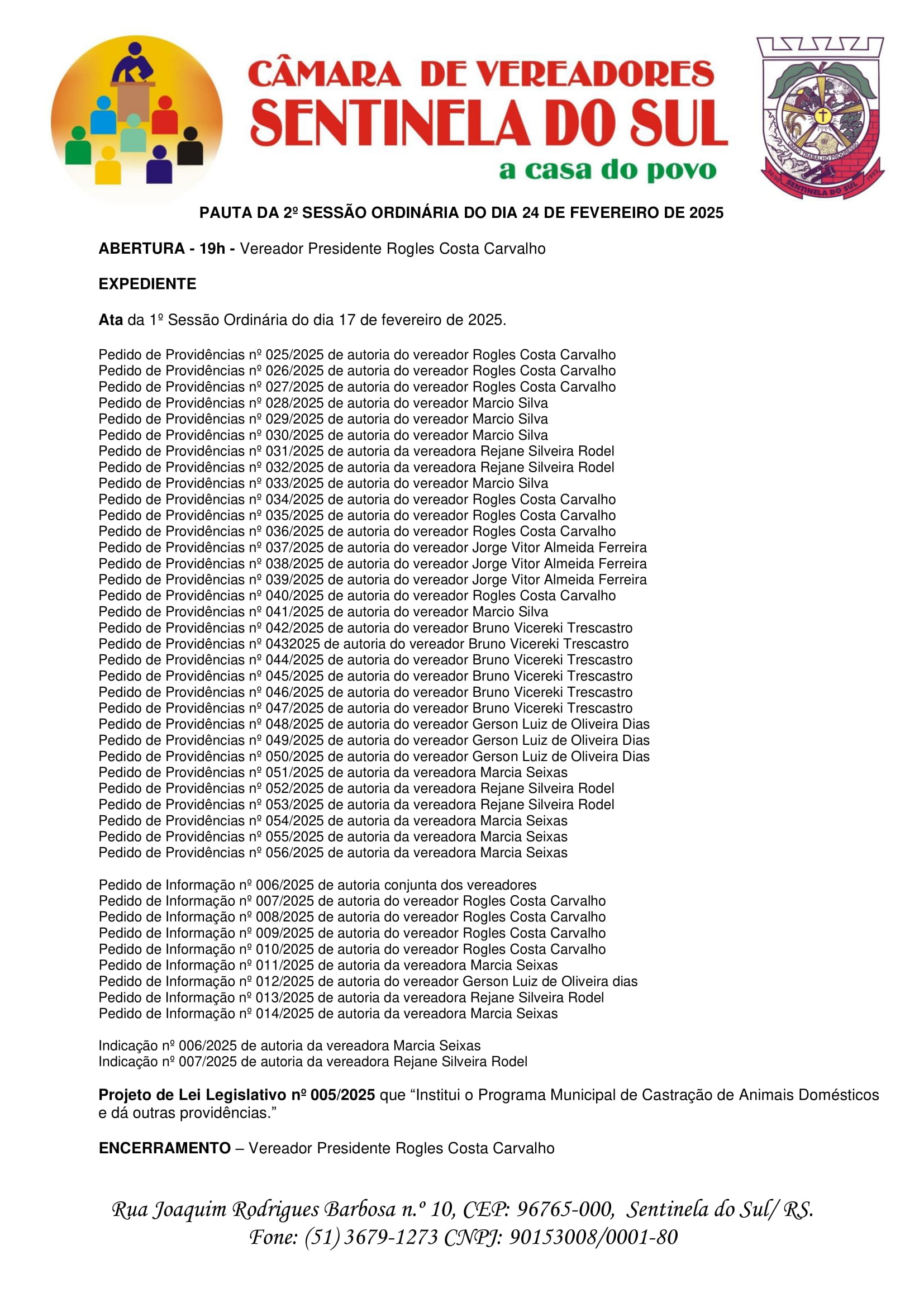 Pauta da 2º Sessão Ordinária do dia 24 de fevereiro de 2025.