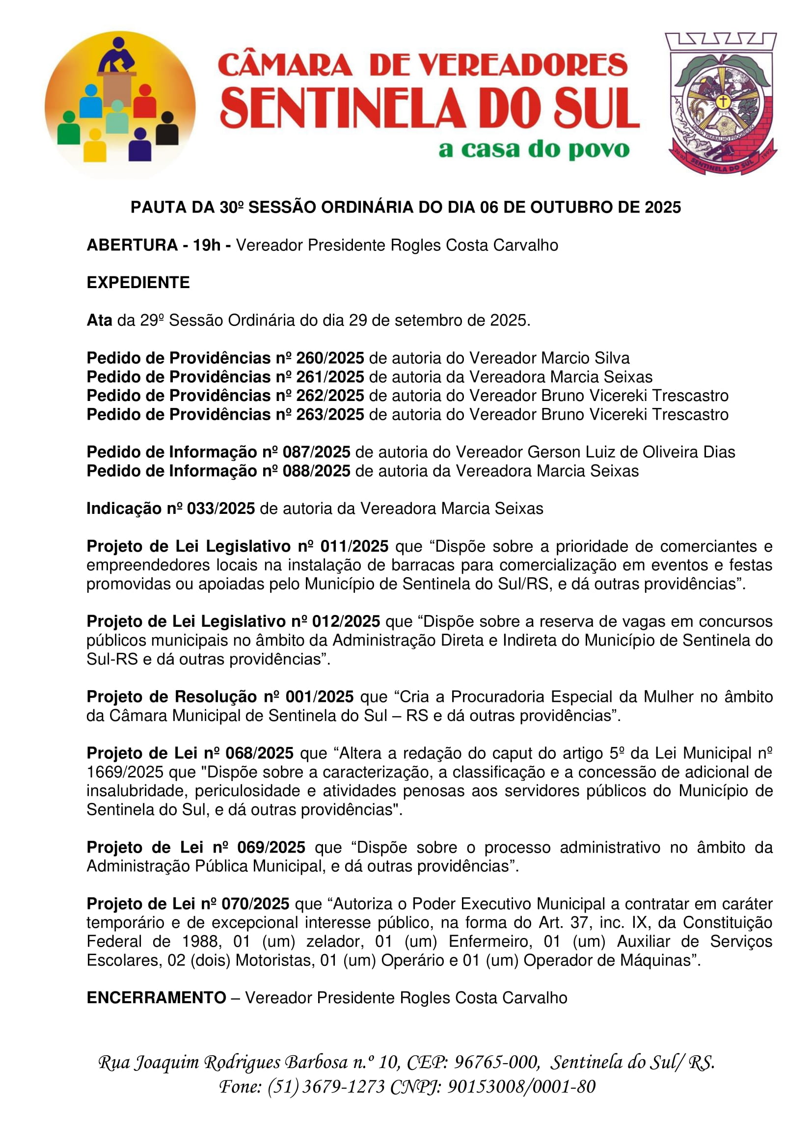 Pauta da 30º Sessão Ordinária do dia 06 de Outubro de 2025.