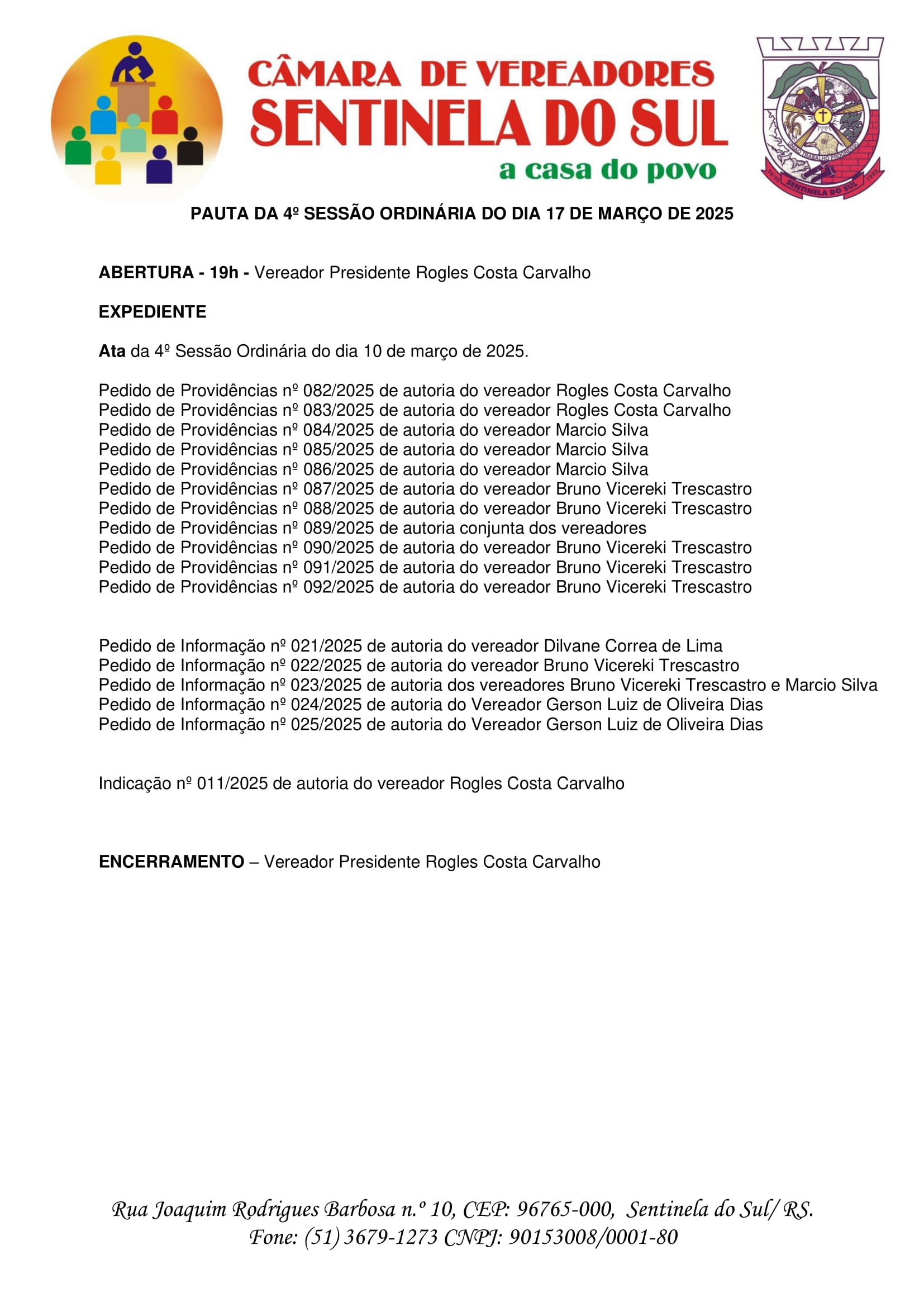 Pauta da 5º Sessão Ordinária do dia 17 de março de 2025.