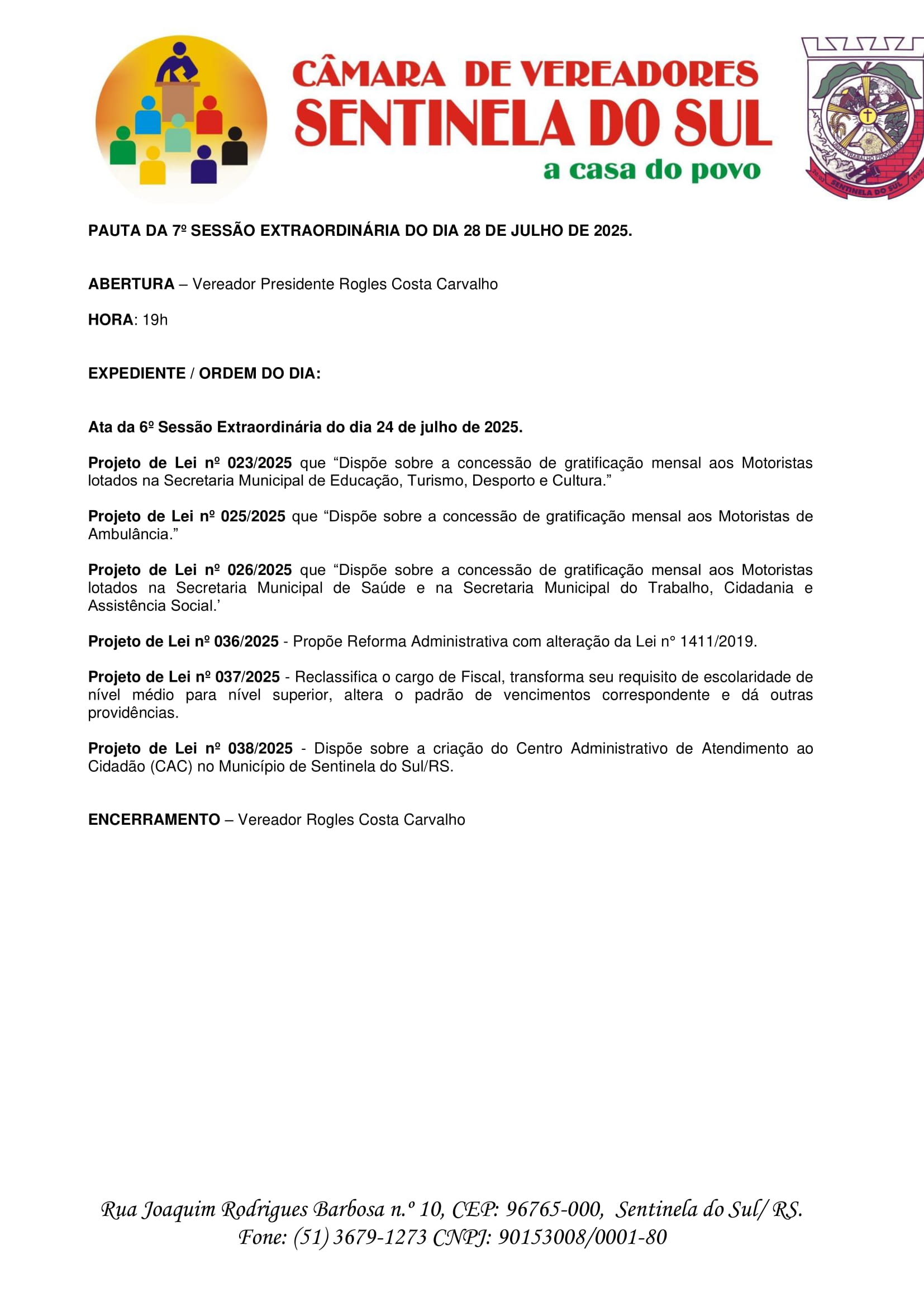 Pauta da 7º Sessão Extraordinaria do dia 28 de julho de 2025.