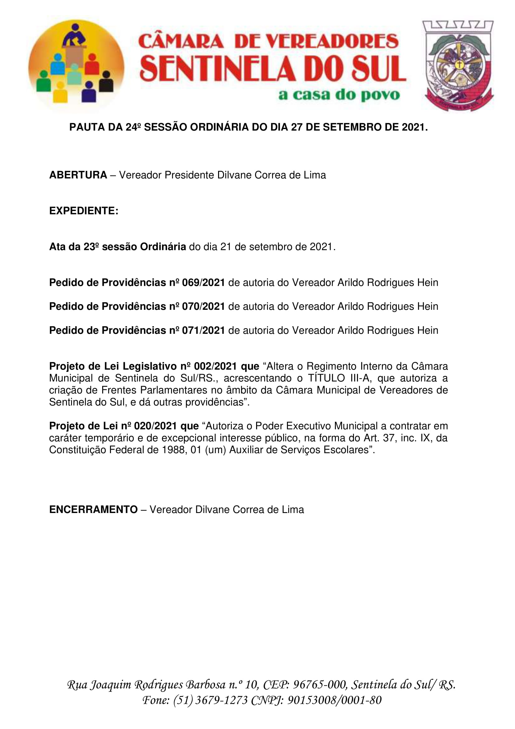 Pauta da 24º Sessão Ordinária do dia 27 de setembro de 2021