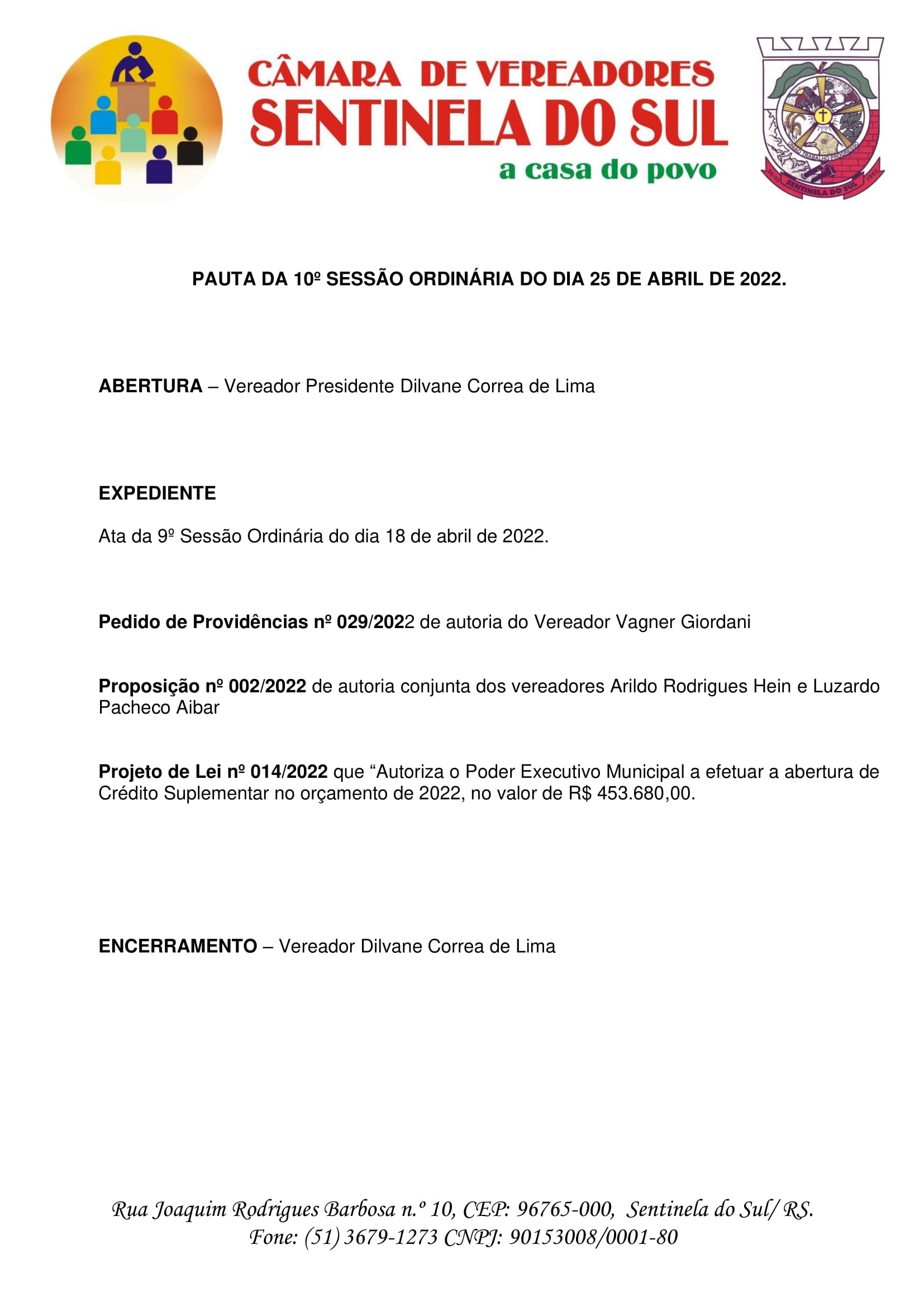 Pauta da 10º Sessão Ordinária do dia 25 de abril de 2022