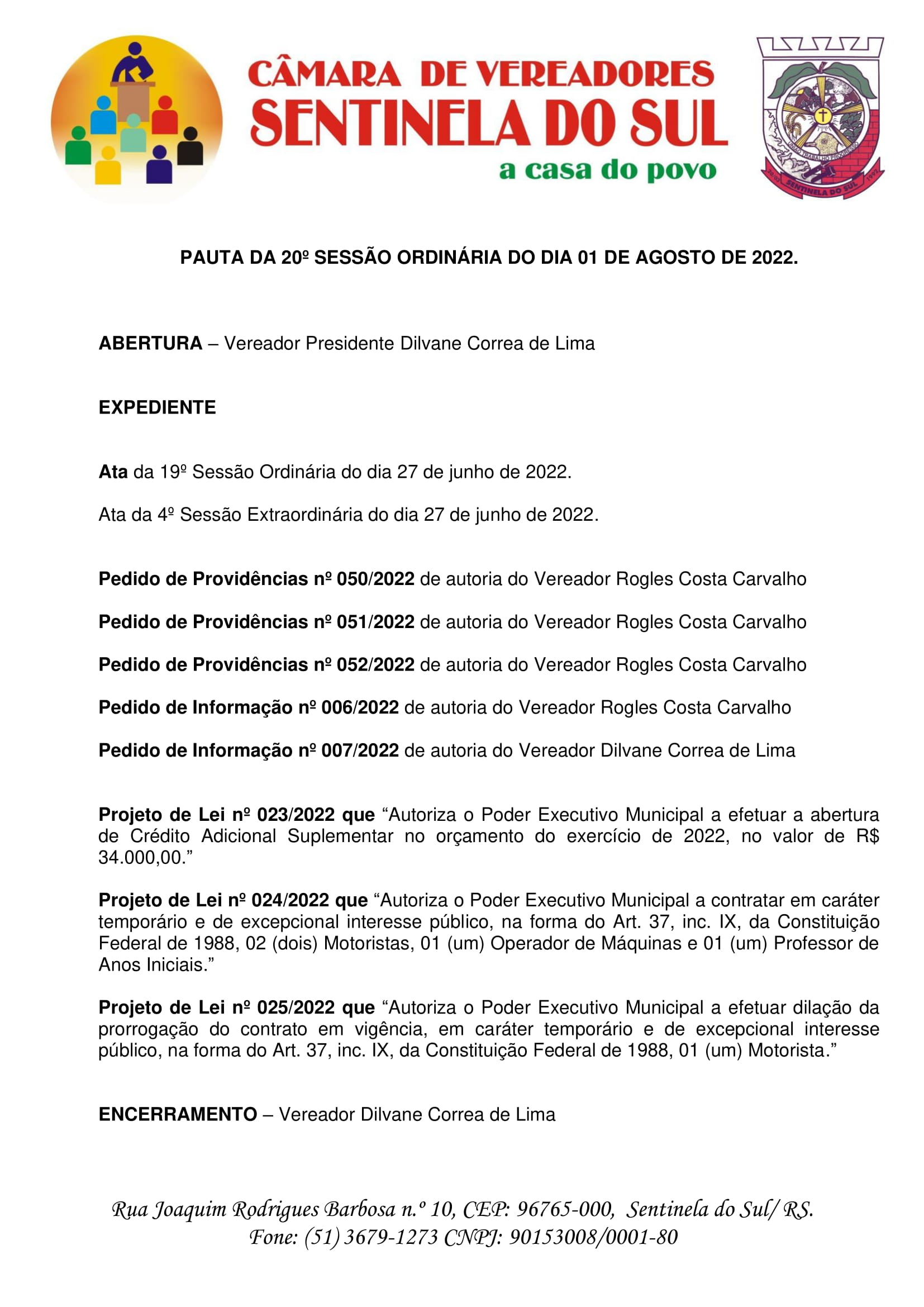 Pauta da 20º Sessão Ordinária do dia 01 de Agosto de 2022