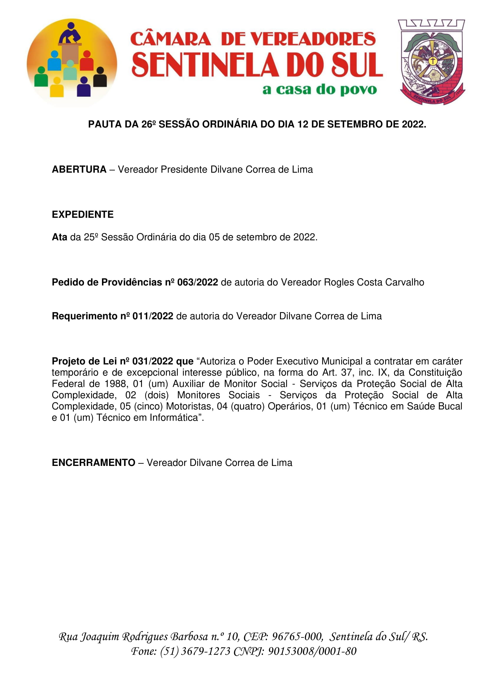 Pauta da 26º Sessão Ordinária do dia 12 de setembro de 2022.