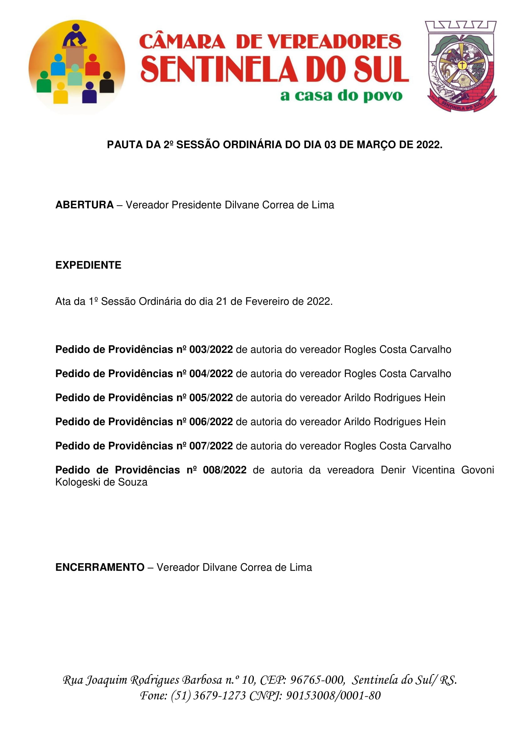 Pauta da 2º Sessão Ordinária do dia 03 de março de 2022