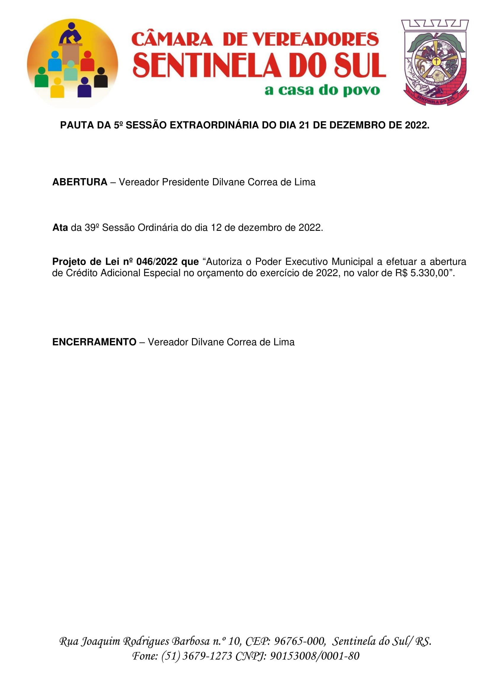 Pauta da 5º Sessão Extraordinária do dia 21 de dezembro de 2022