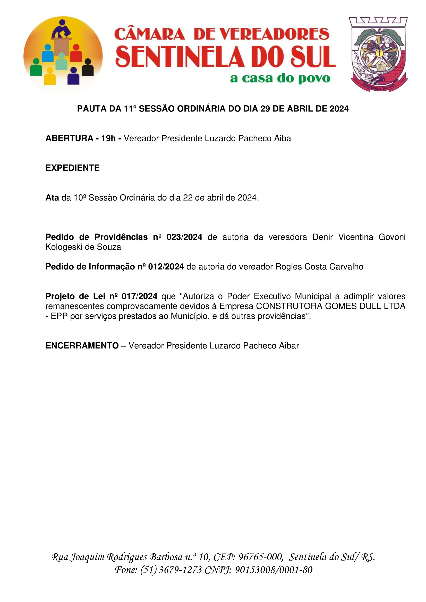 Pauta da 11º Sessão Ordinária do dia 29 de abril de 2024