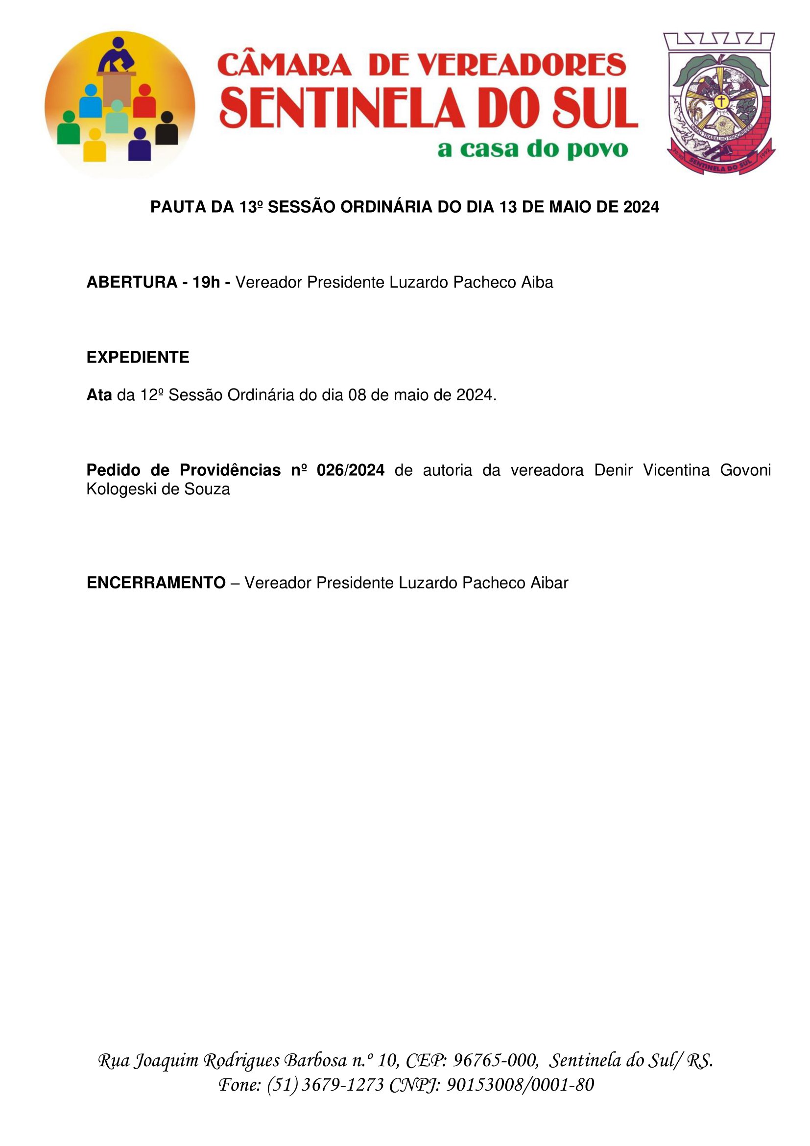 Pauta da 13º Sessão Ordinária do dia 13 de maio de 2024
