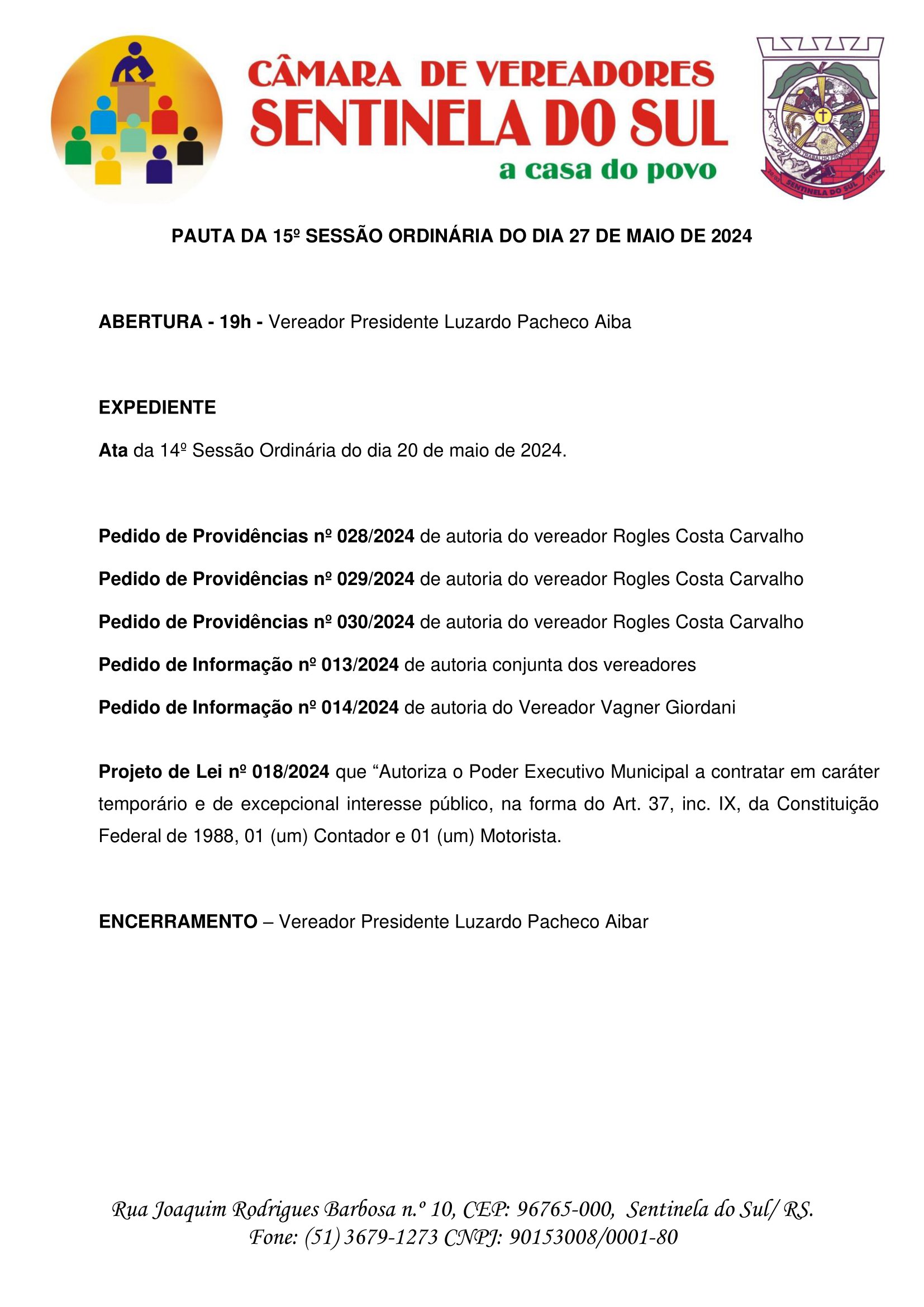 Pauta da 15º Sessão Ordinária do dia 27 de maio de 2024