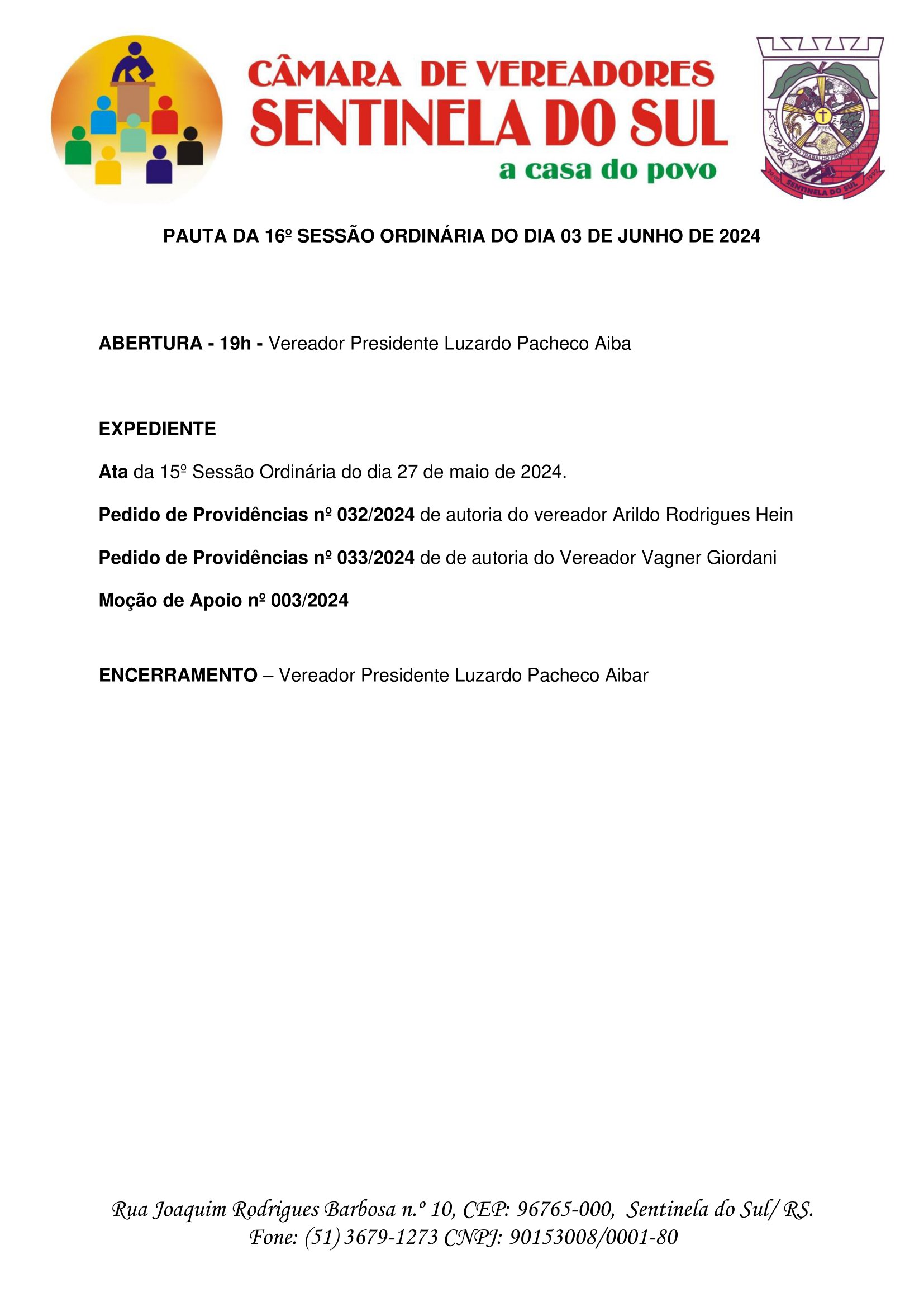 Pauta da 16º Sessão Ordinária do dia 03 de junho de 2024