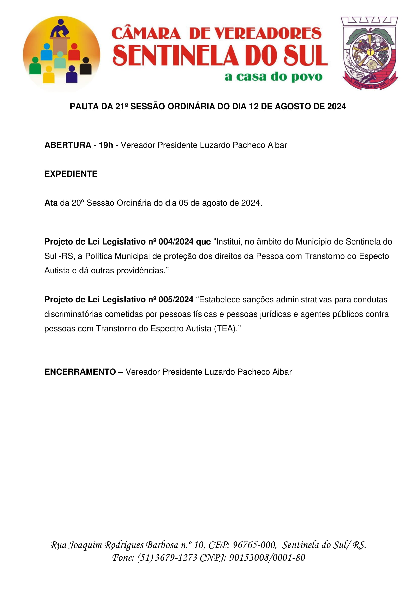 Pauta da 21º Sessão Ordinária do dia 12 de Agosto de 2024