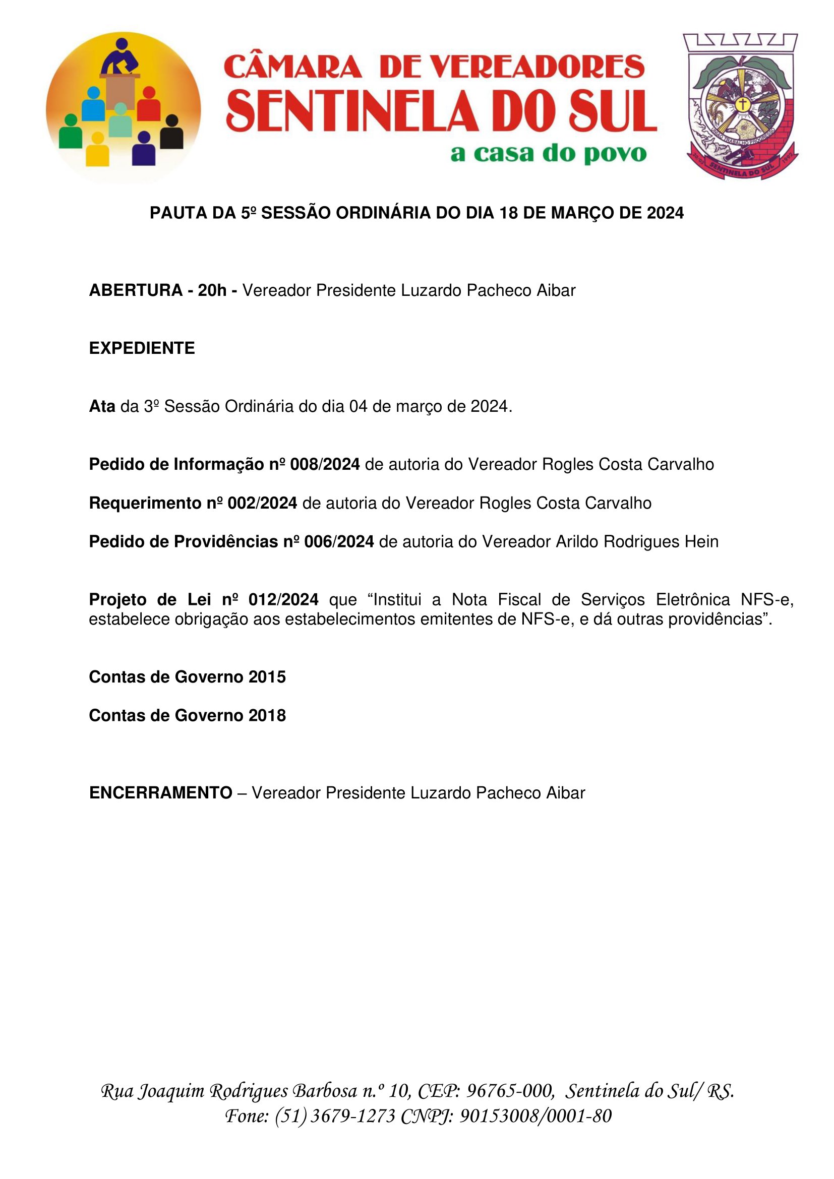 Pauta da 5º Sessão Ordinária do dia 18 de março de 2024
