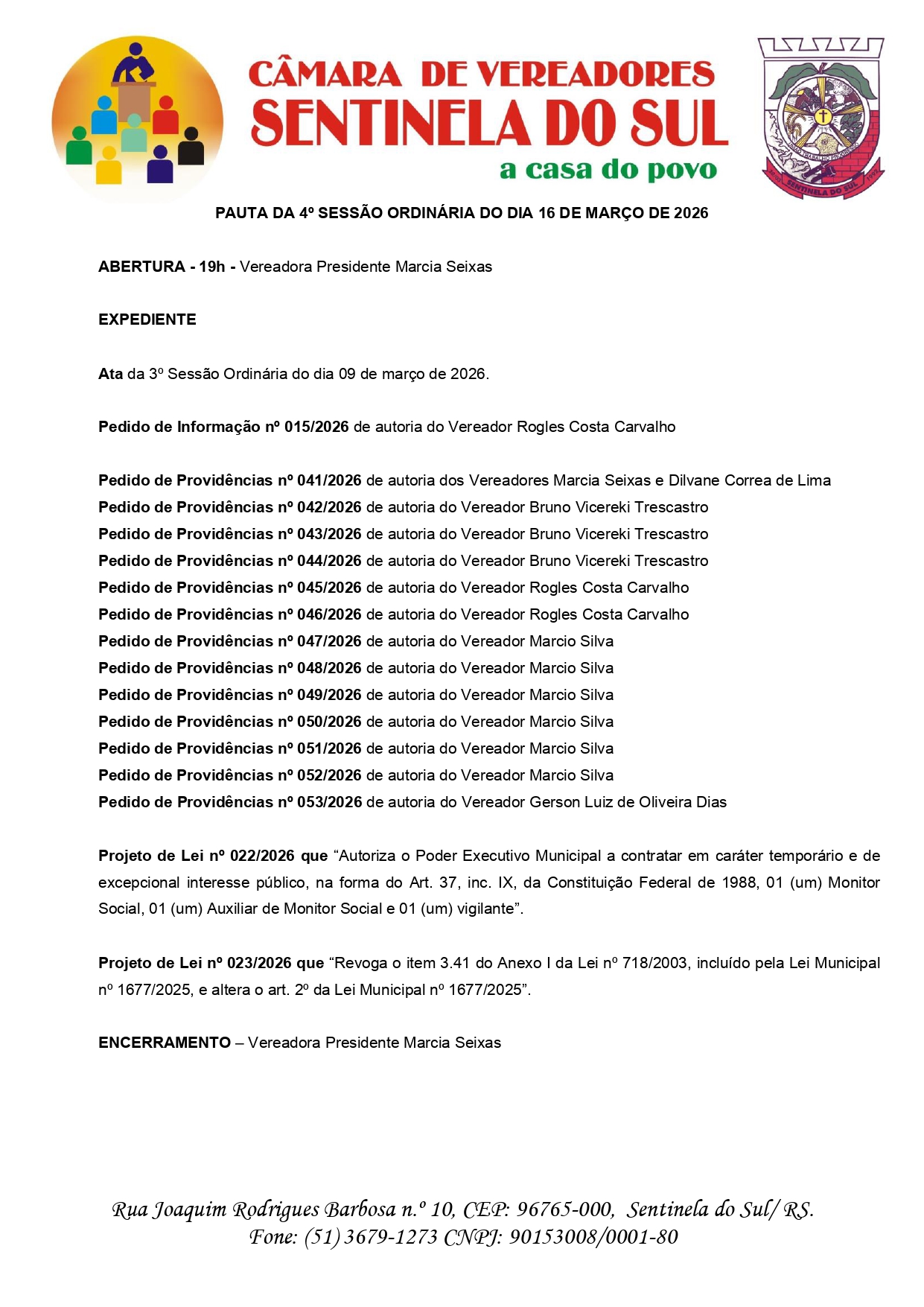 Pauta da 4º Sessão Ordinária do dia 16 de Março de 2026