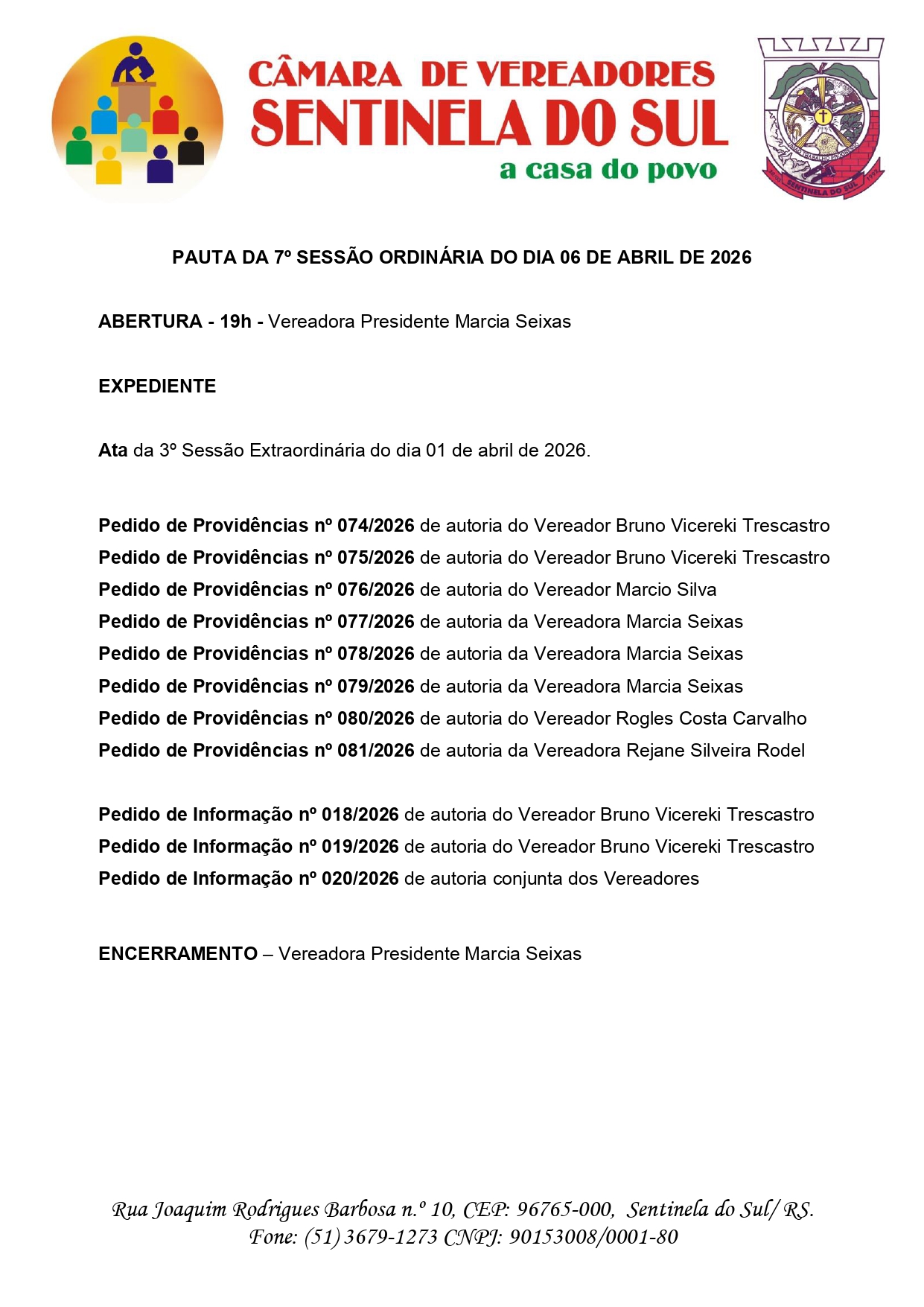Pauta da 7º Sessão Ordinária do dia 06 de Abril de 2026