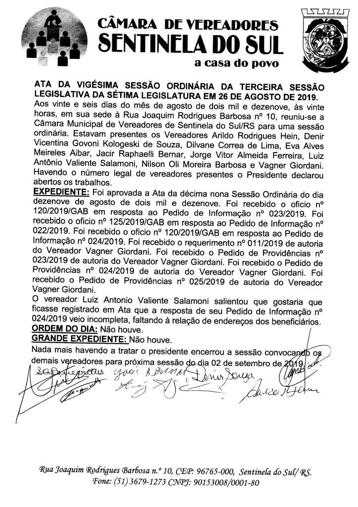 ATA DA 20º SESSÃO ORDINÁRIA DO DIA 26 DE AGOSTO DE 2019
