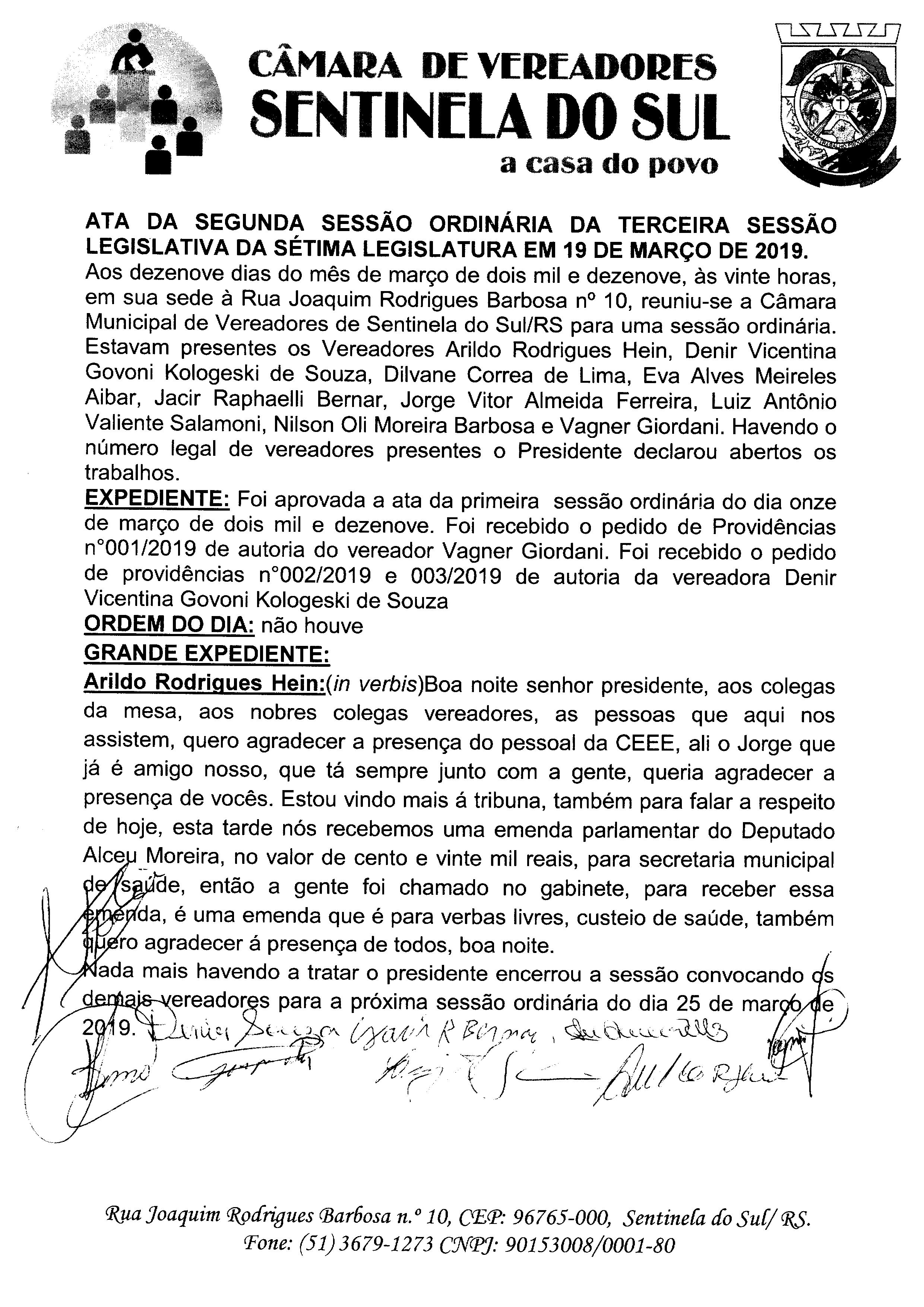 ATA DA 2º SESSÃO ORDINARIA DO DIA 19 DE MARÇO DE 2019