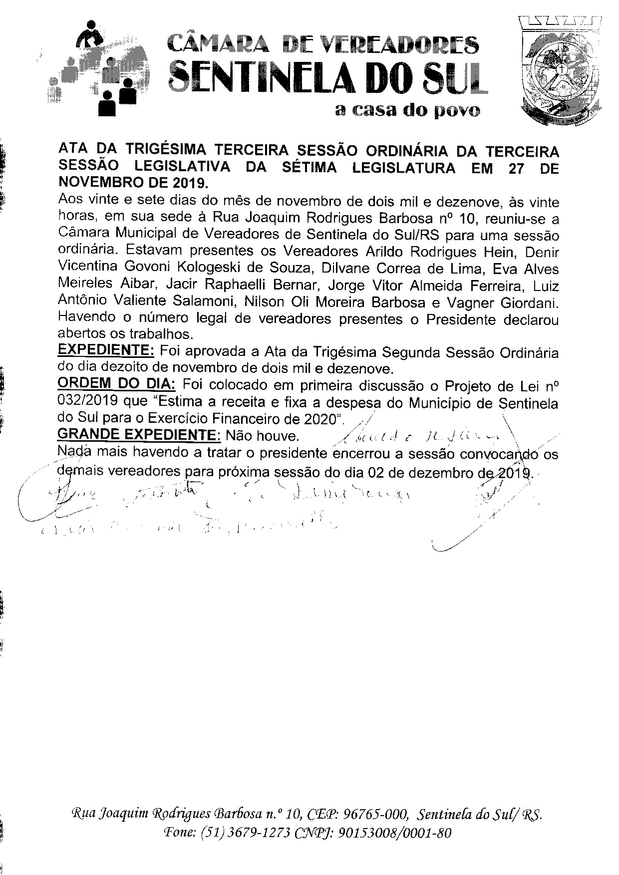 ATA DA 33º SESSÃO ORDINÁRIA DO DIA 27 DE NOVEMBRO DE 2019