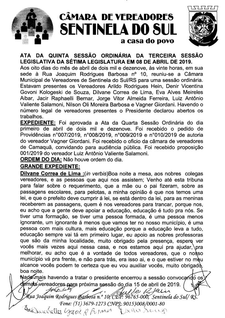 ATA DA 5º SESSÃO ORDINÁRIA DO DIA 08 DE ABRIL DE 2019