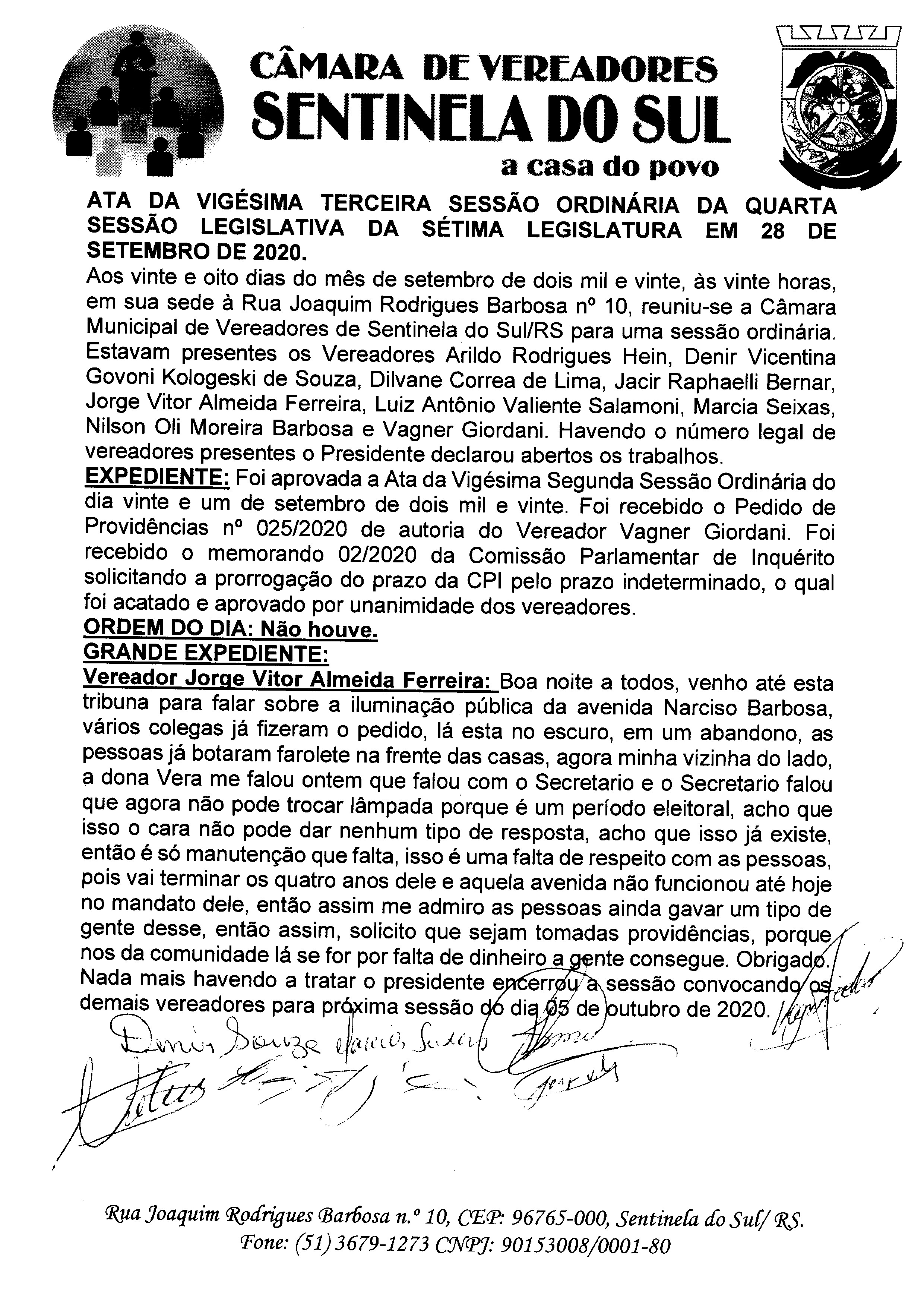 ATA DA 23º SESSÃO ORDINARIA DO DIA 28 DE SETEMBRO DE 2020