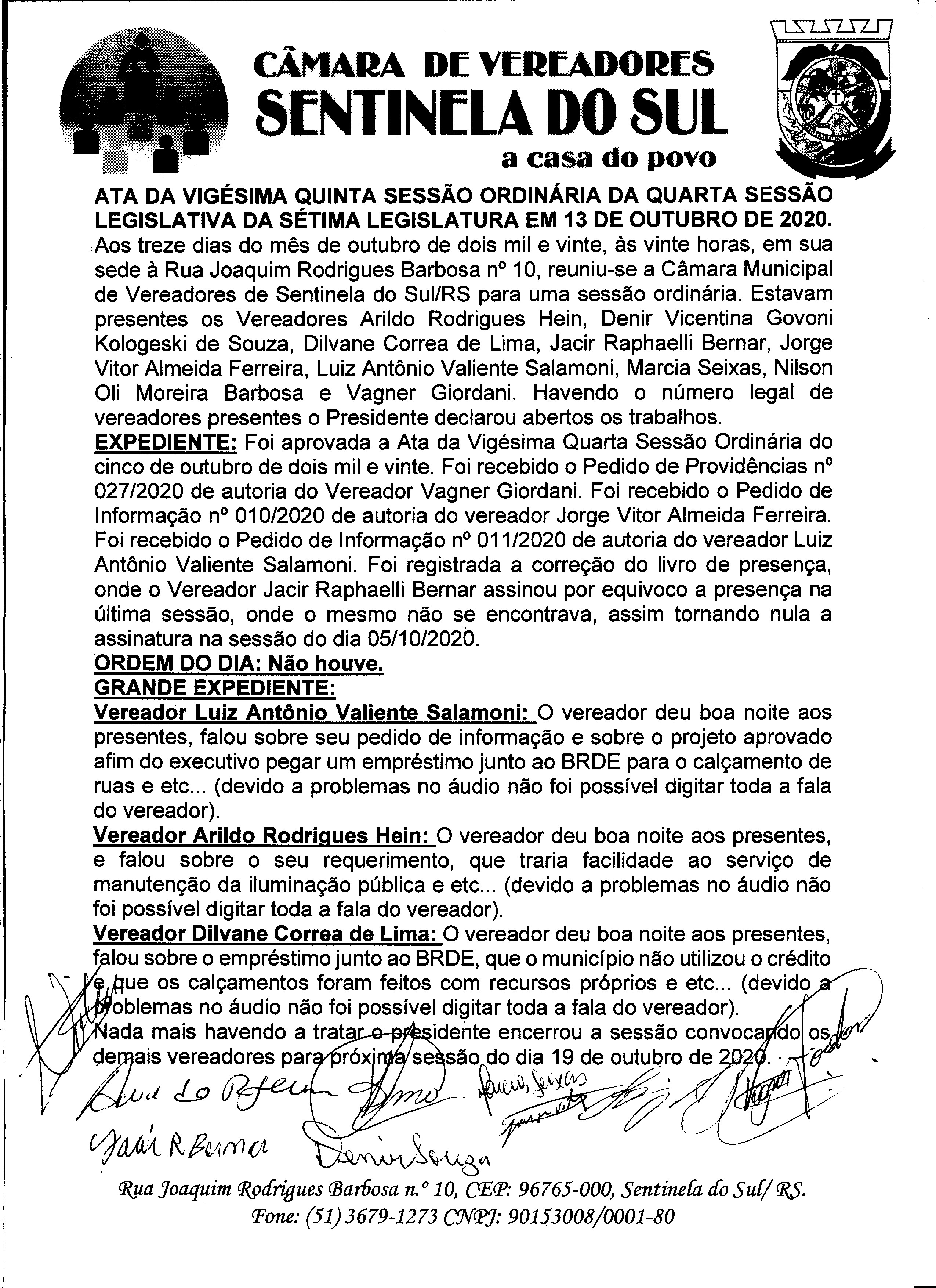 ATA DA 25º SESSÃO ORDINARIA DO DIA 13 DE OUTUBRO DE 2020
