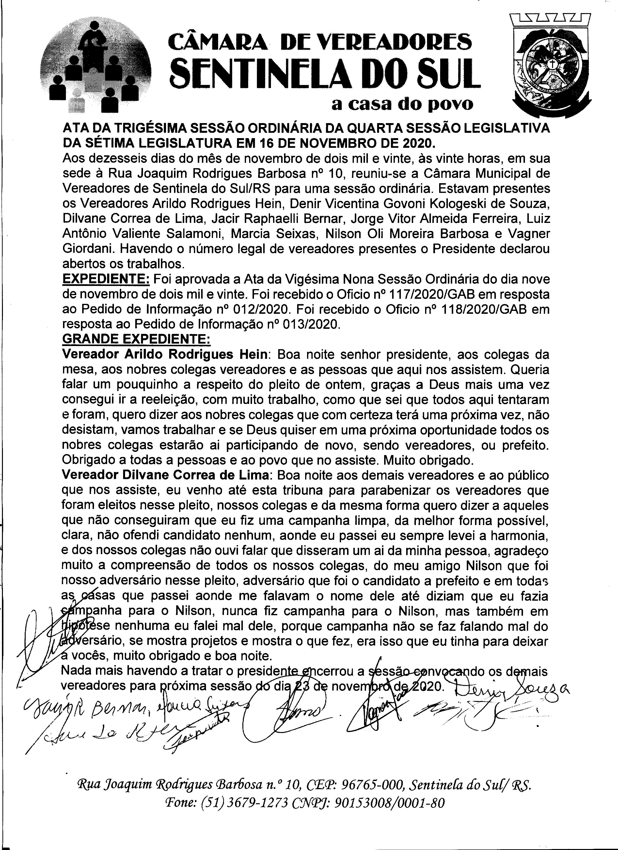 ATA DA 30º SESSÃO ORDINARIA DO DIA 16 DE NOVEMBRO DE 2020
