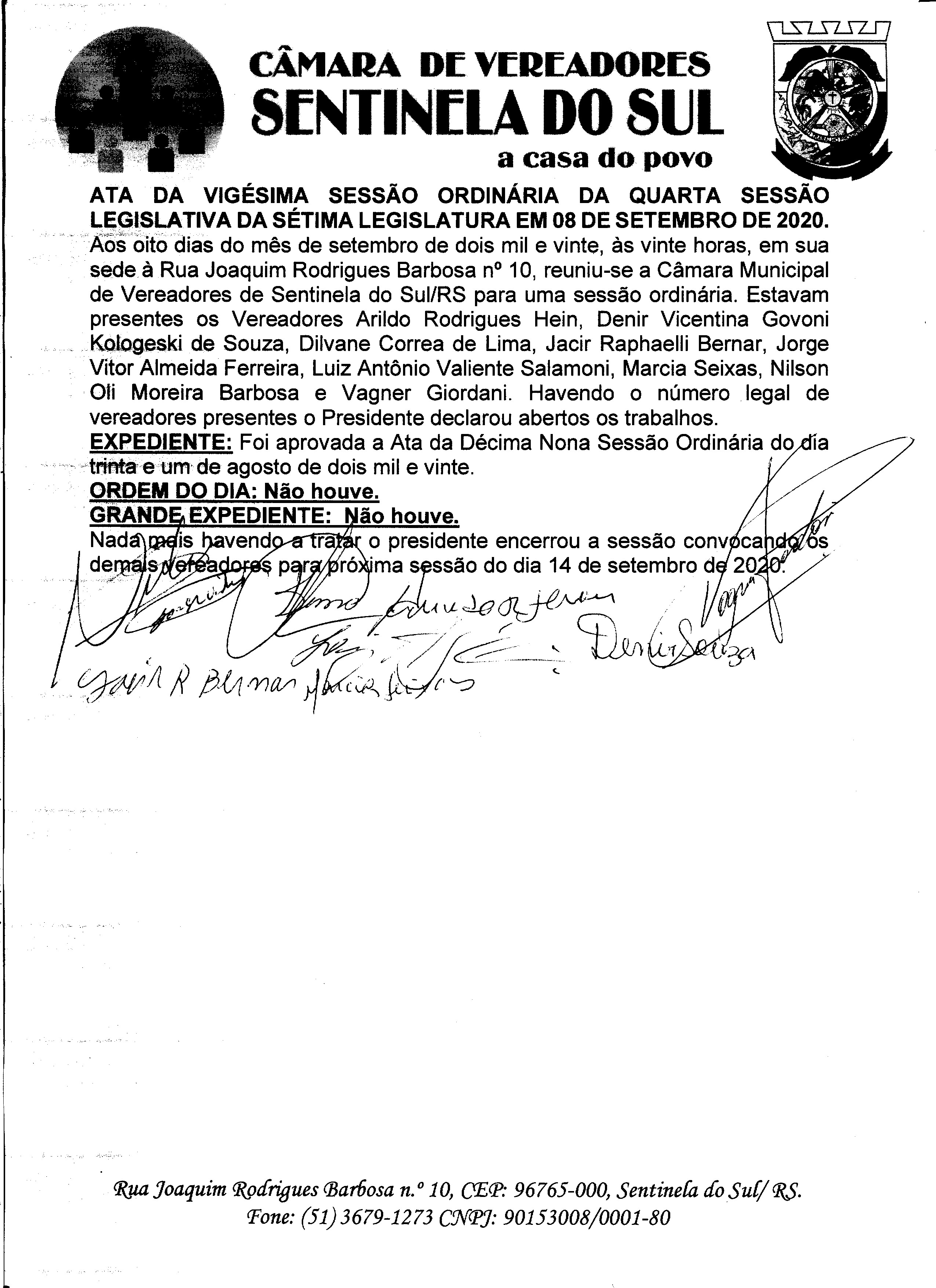 ATA DA 20º SESSÃO ORDINÁRIA DO DIA 08 DE SETEMBRO 2020.