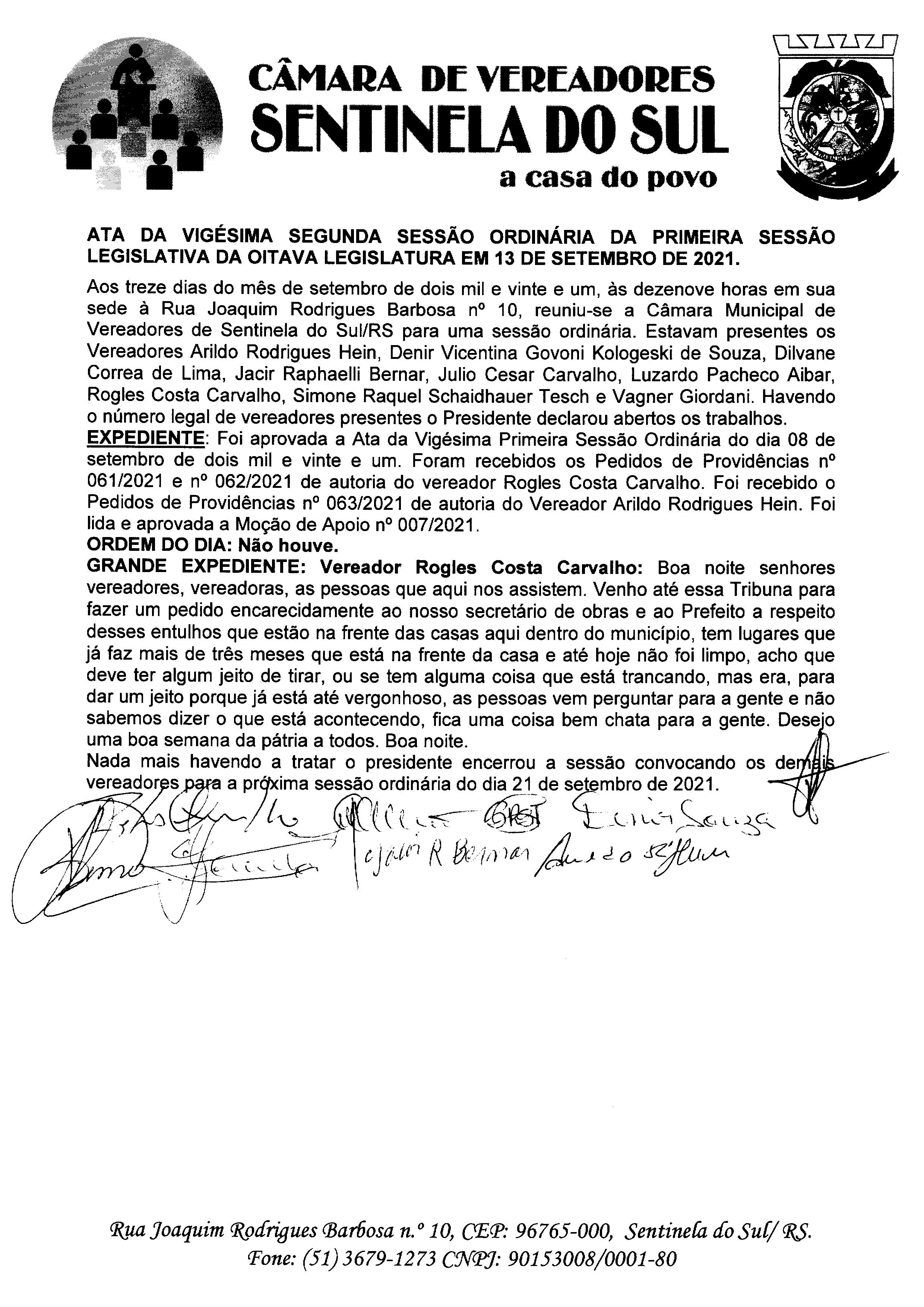 ATA DA 22º SESSÃO ORDINARIA DO DIA 13 DE SETEMBRO DE 2021.