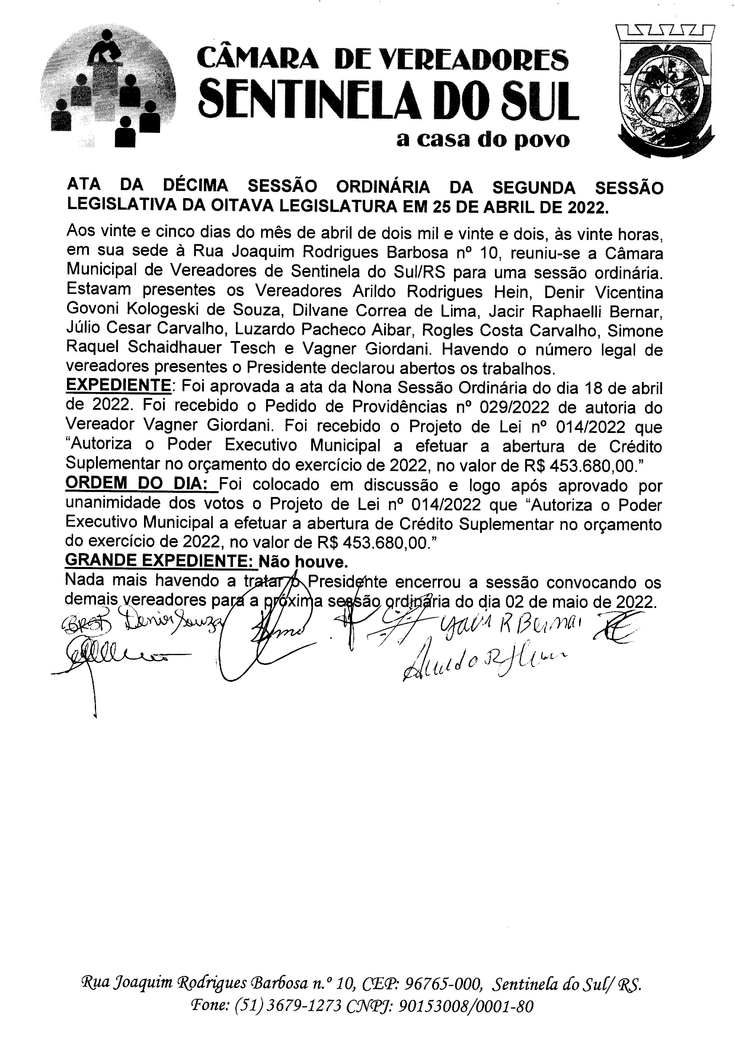 ATA DA 10º SESSÃO ORDINÁRIA DO DIA 25 DE ABRIL DE 2022.