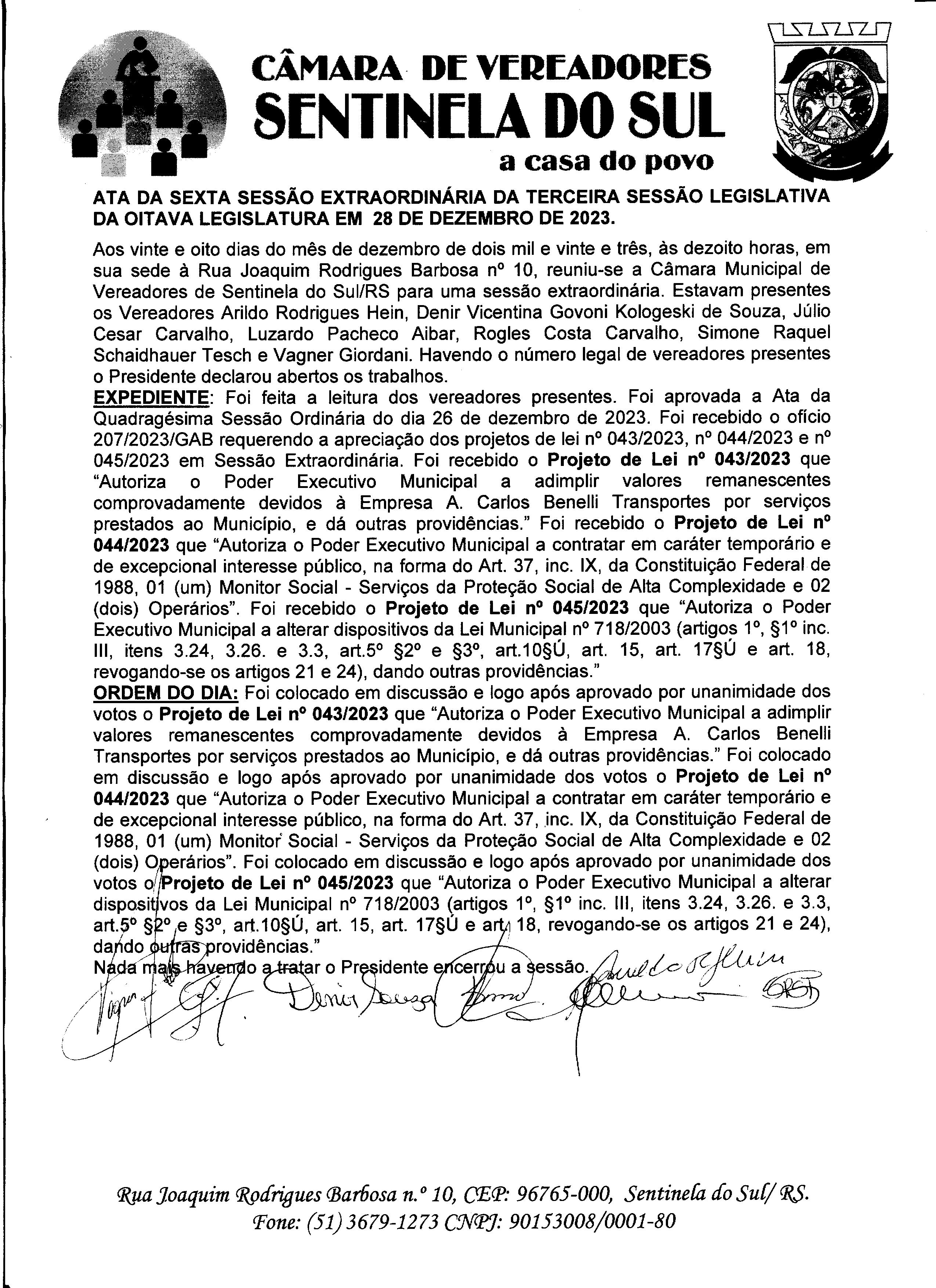 ATA DA 6º SESSÃO EXTRAORDINÁRIA DO DIA 28 DE DEZEMBRO DE 2023