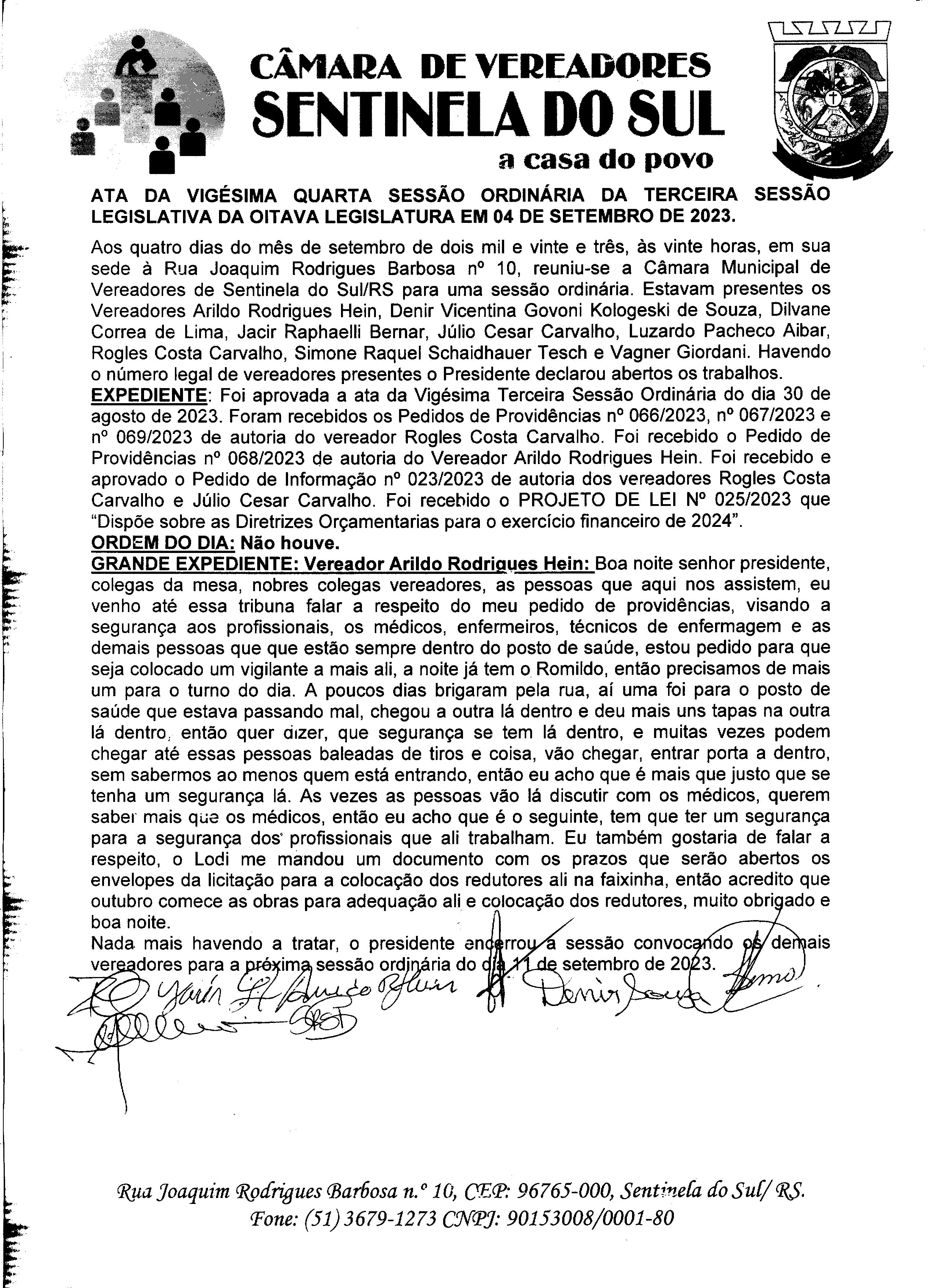 ATA DA 24º SESSÃO ORDINÁRIA DO DIA 04 DE SETEMBRO DE 2023