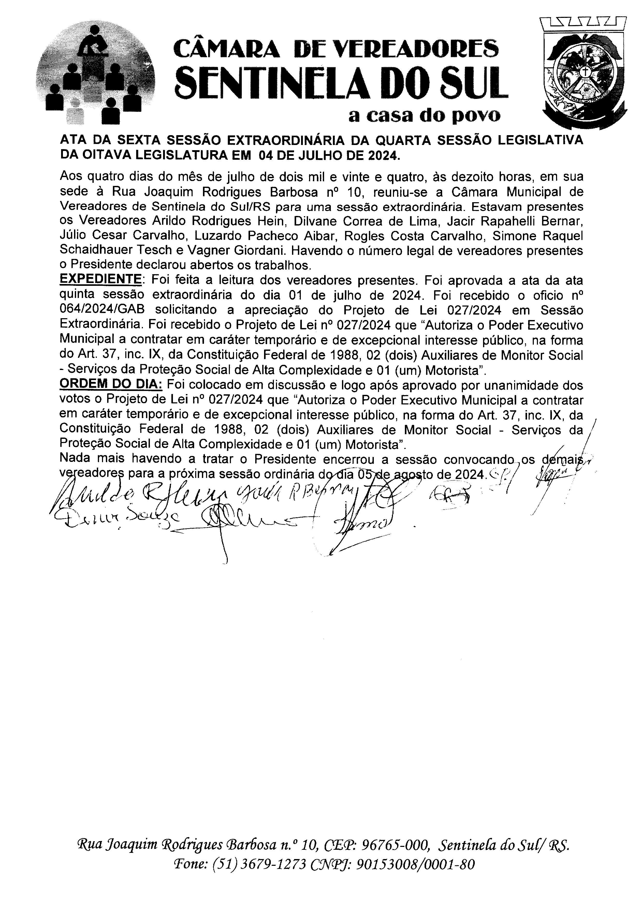 6º Sessão Extraordinária do dia 04 de julho de 2024.