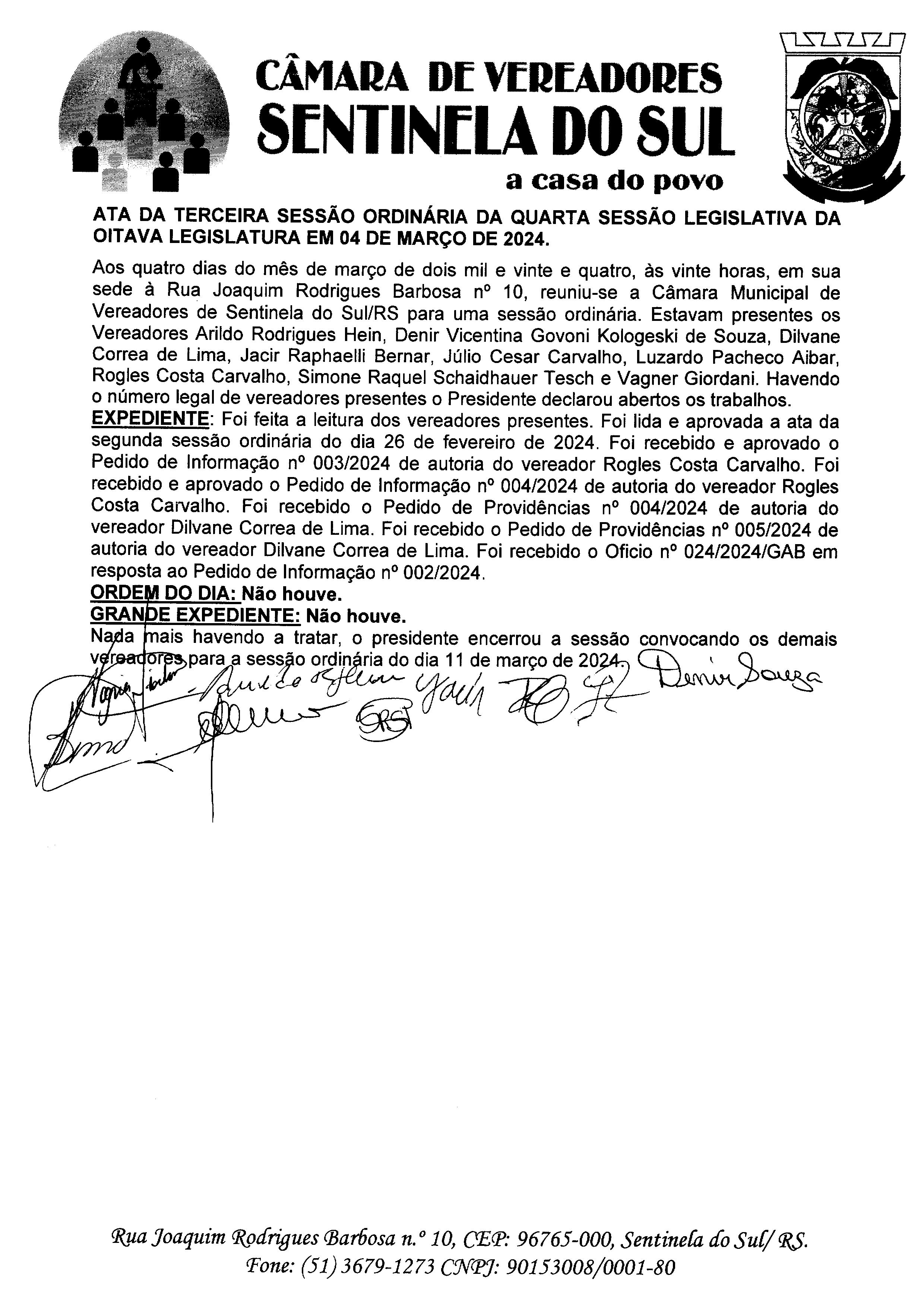 ATA DA 3º SESSÃO ORDINÁRIA DO DIA 04 DE MARÇO DE 2024