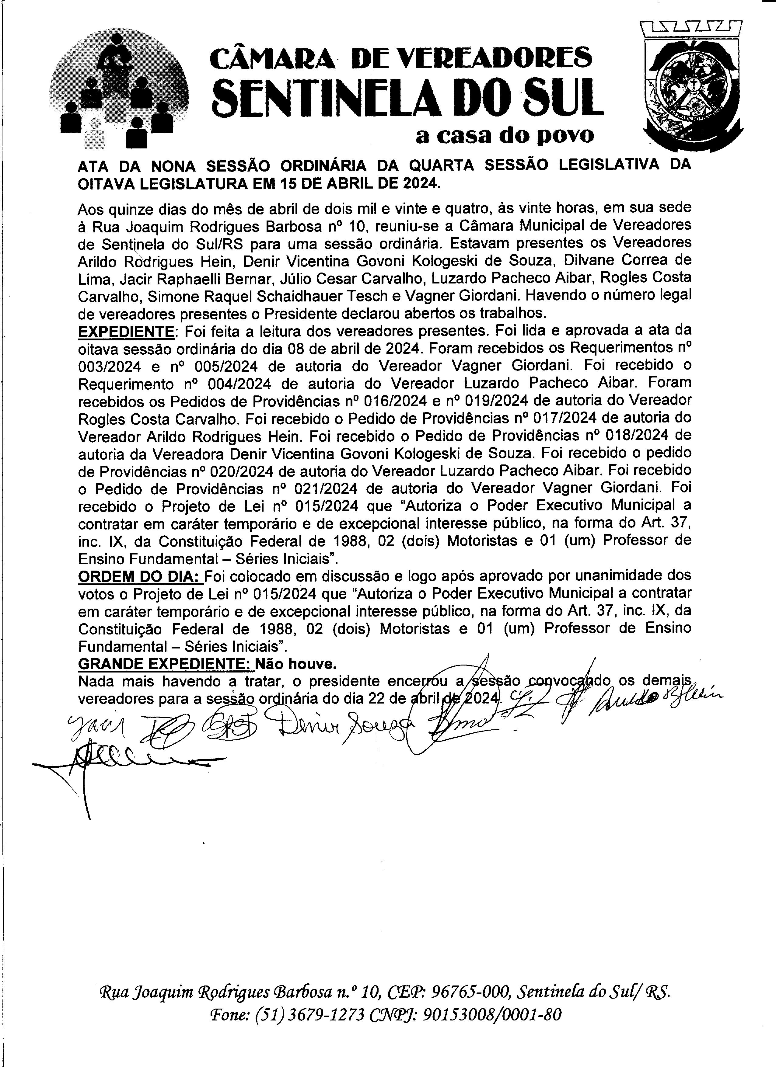 ATA DA 9º SESSÃO ORDINÁRIA DO DIA 15 DE ABRIL DE 2024