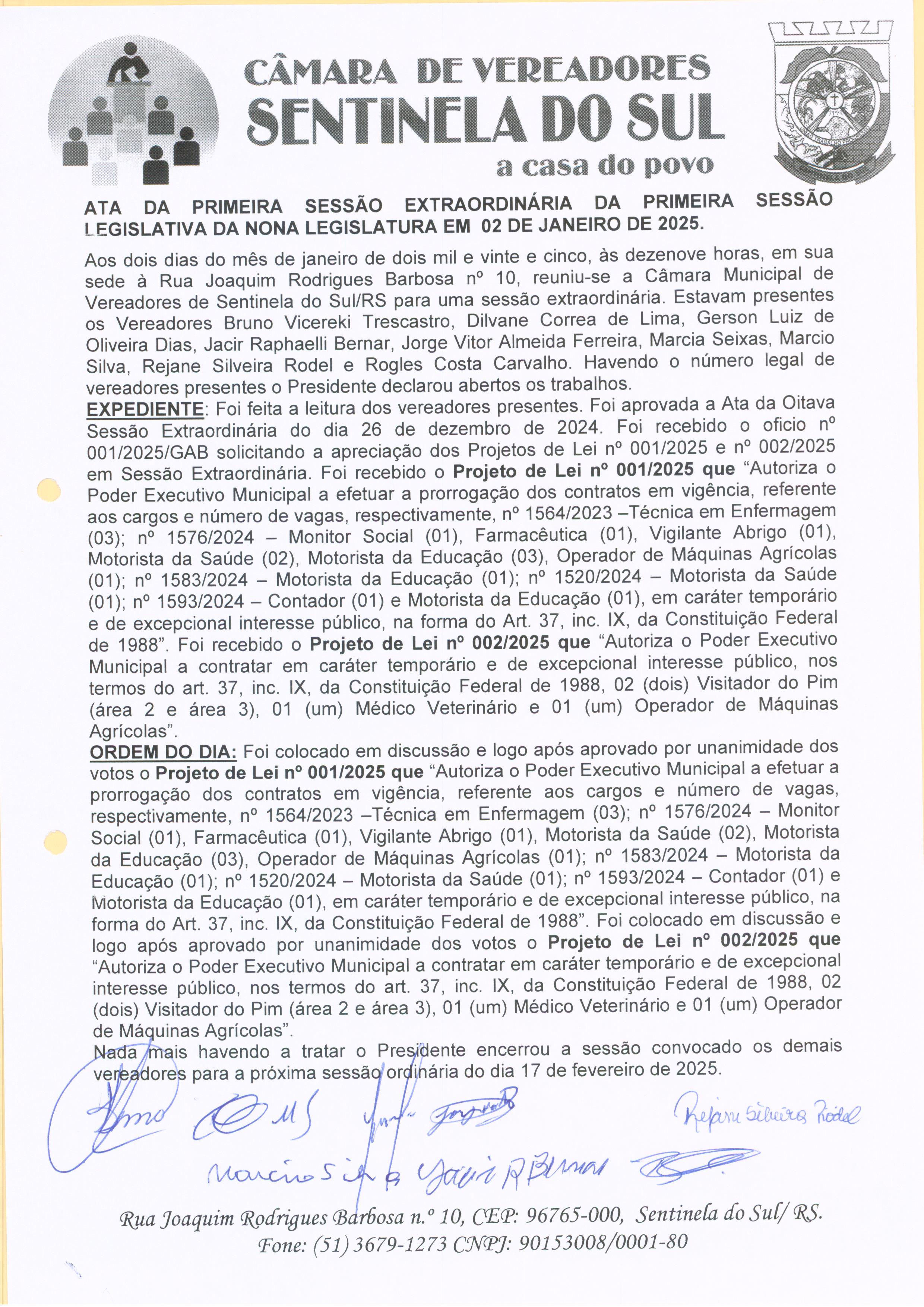 Ata da 1º Sessão Extraordinária do dia 02 de janeiro de 2025