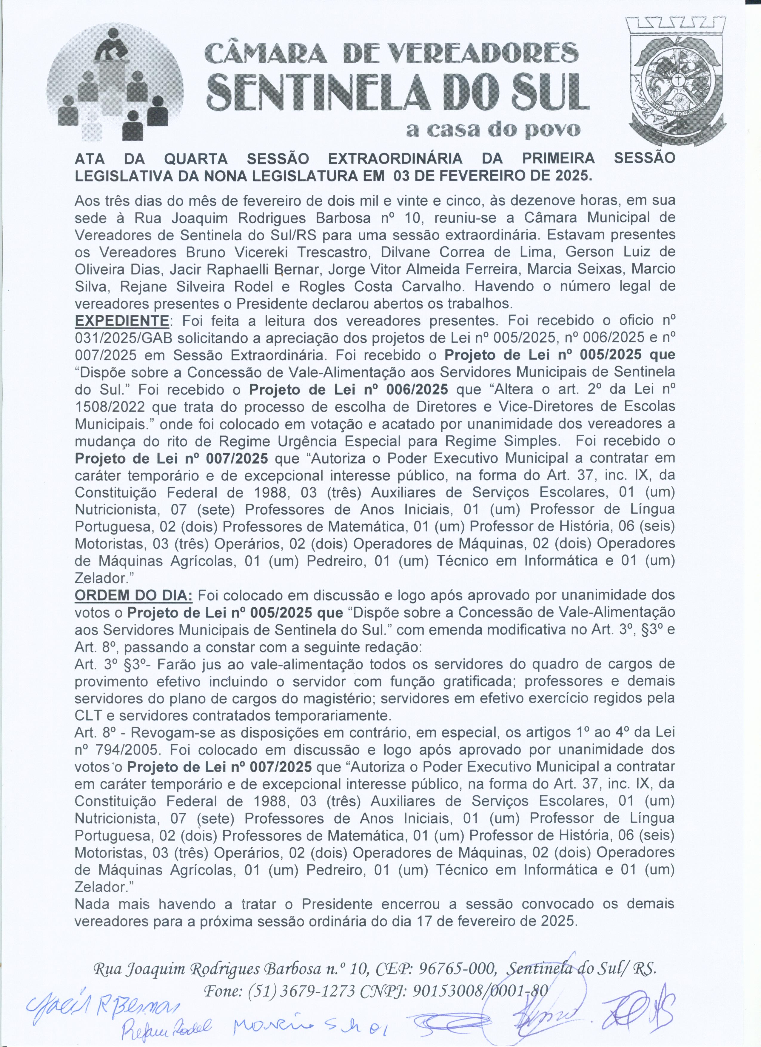 Ata da 4º Sessão Extraordinária do dia 03 de fevereiro de 2025