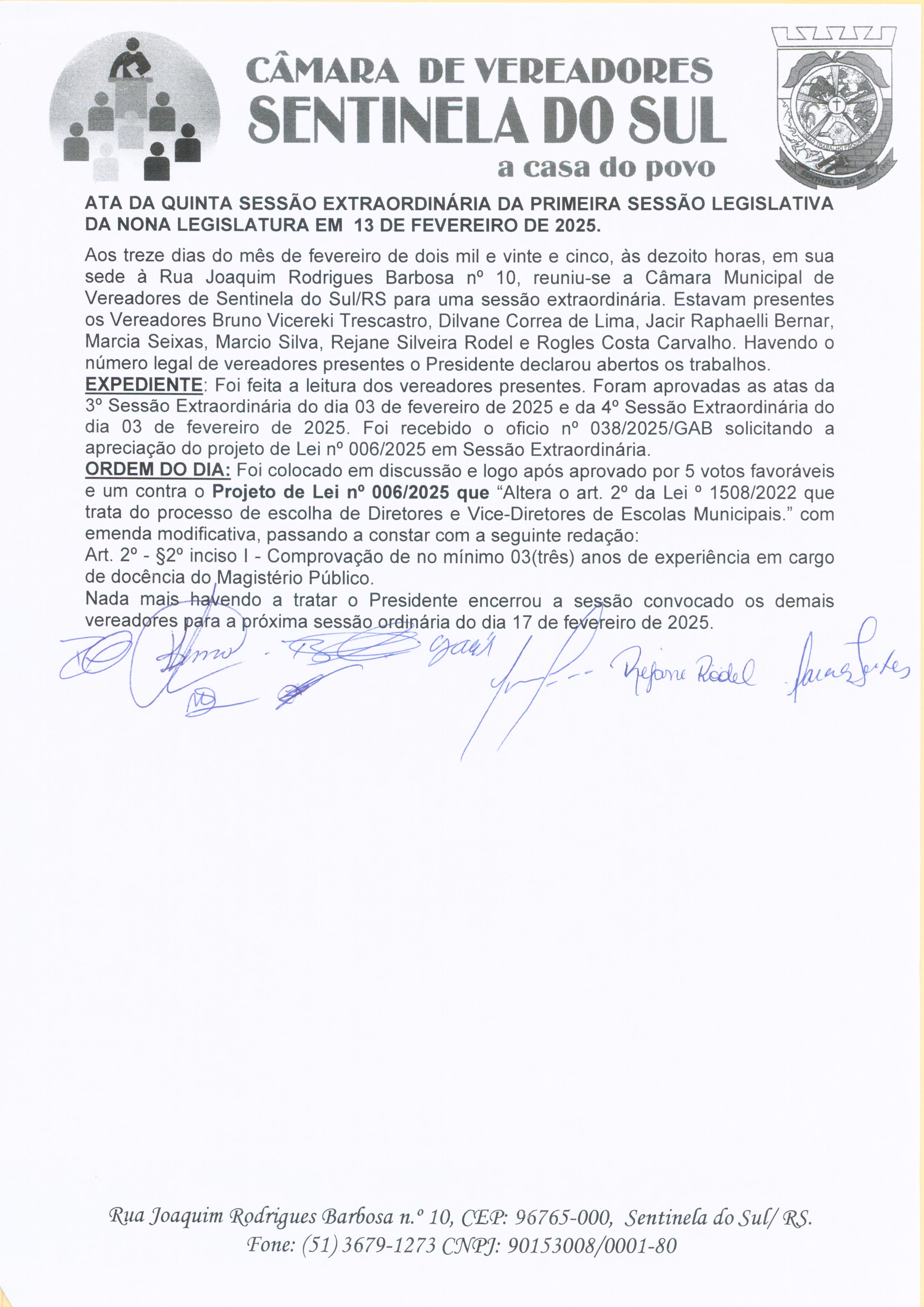 Ata da 5º Sessão Extraordinária do dia 13 de fevereiro de 2025