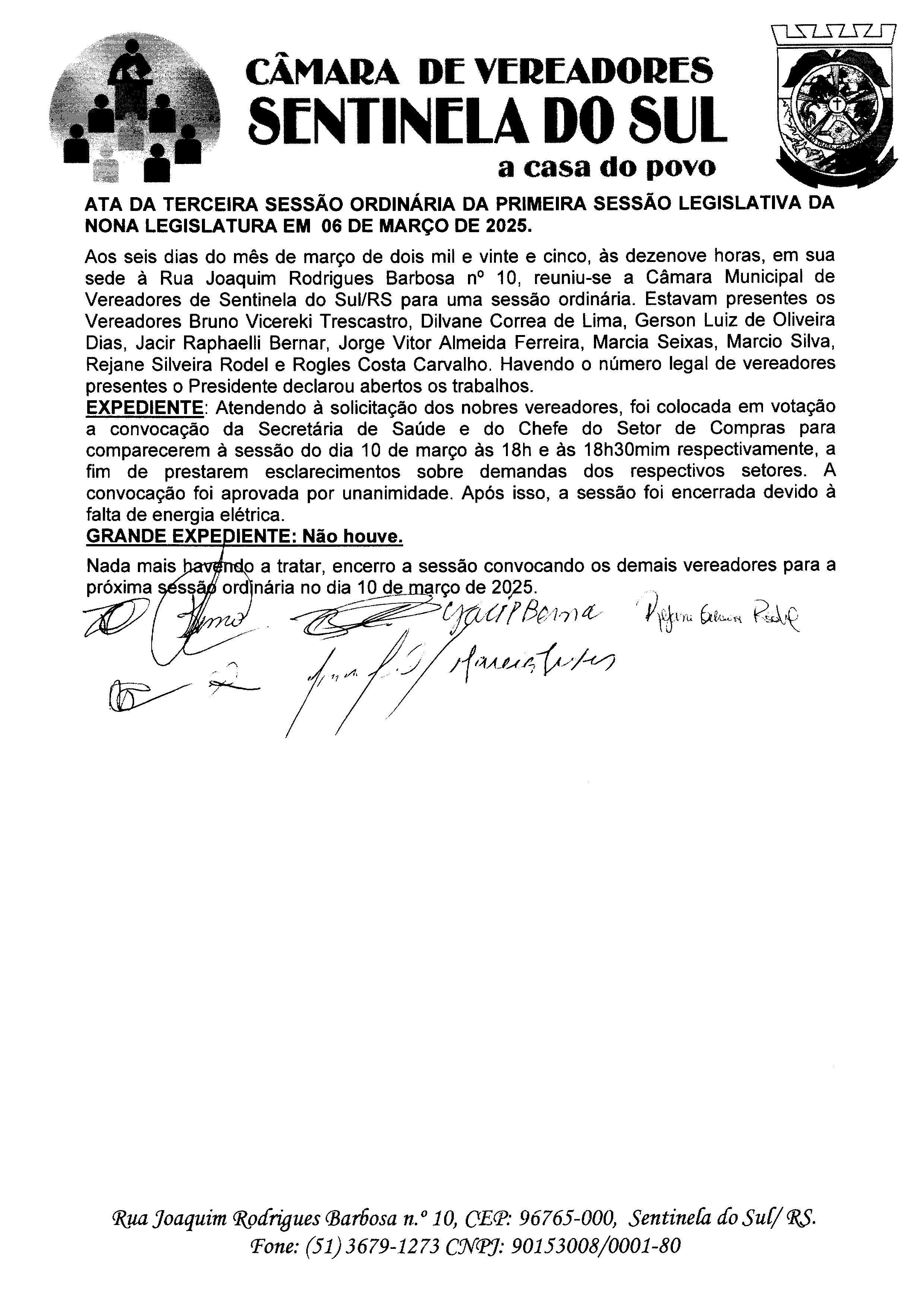 ATA DA 3º SESSÃO ORDINÁRIA DO DIA 06 DE MARÇO DE 2025
