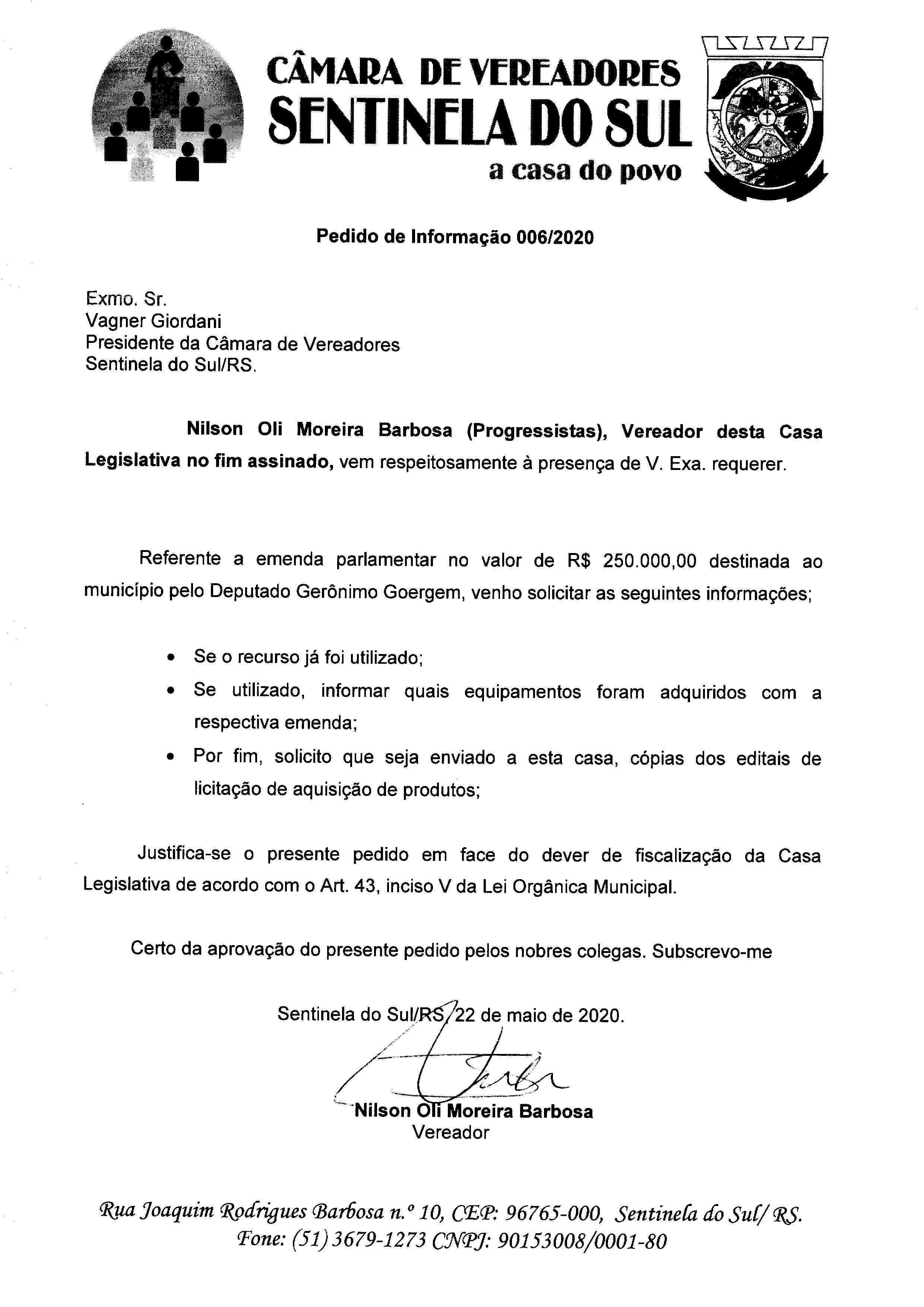 PEDIDO DE INFORMAÇÃO DE AUTORIA DO VEREADOR NILSON OLI MOREIRA BARBOSA