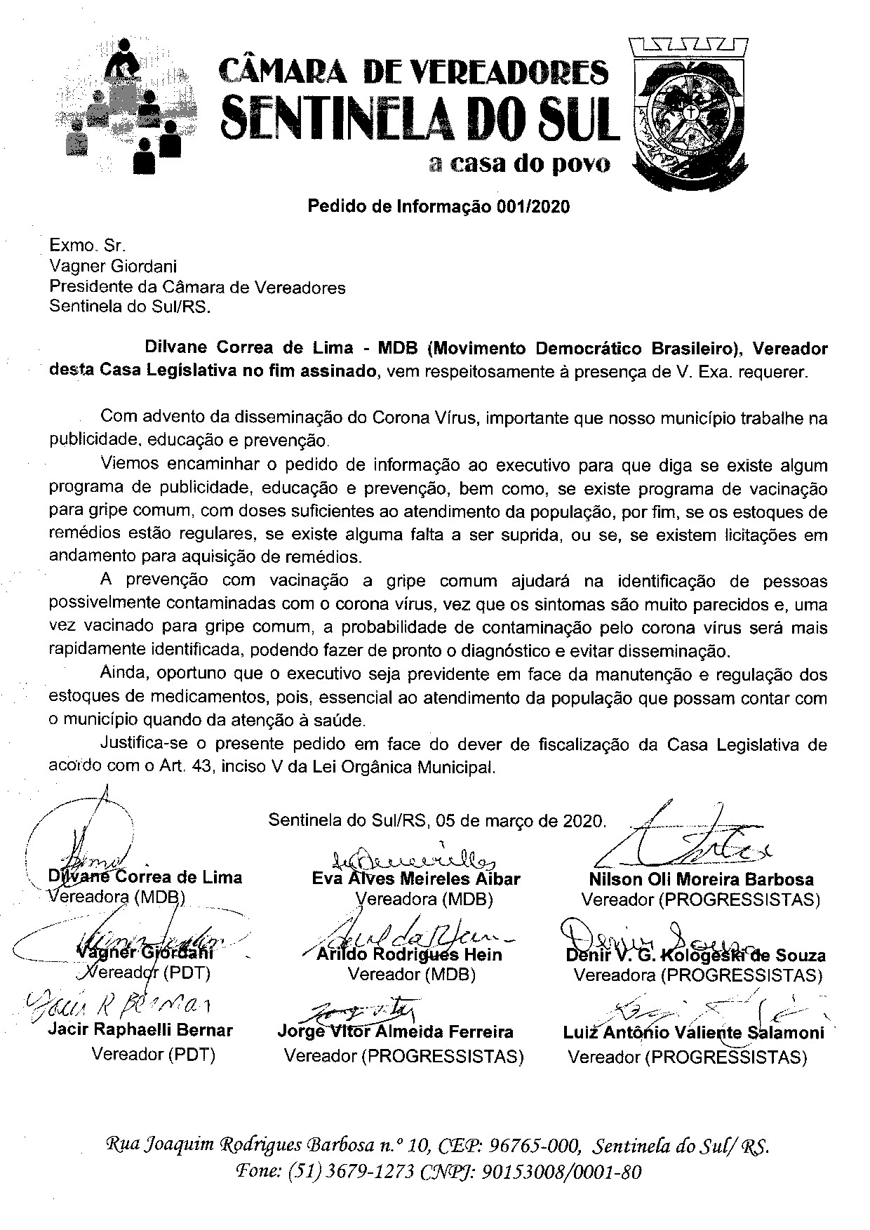 Pedido de Informação de autoria do Vereador Dilvane Correa de Lima e demais vereadores
