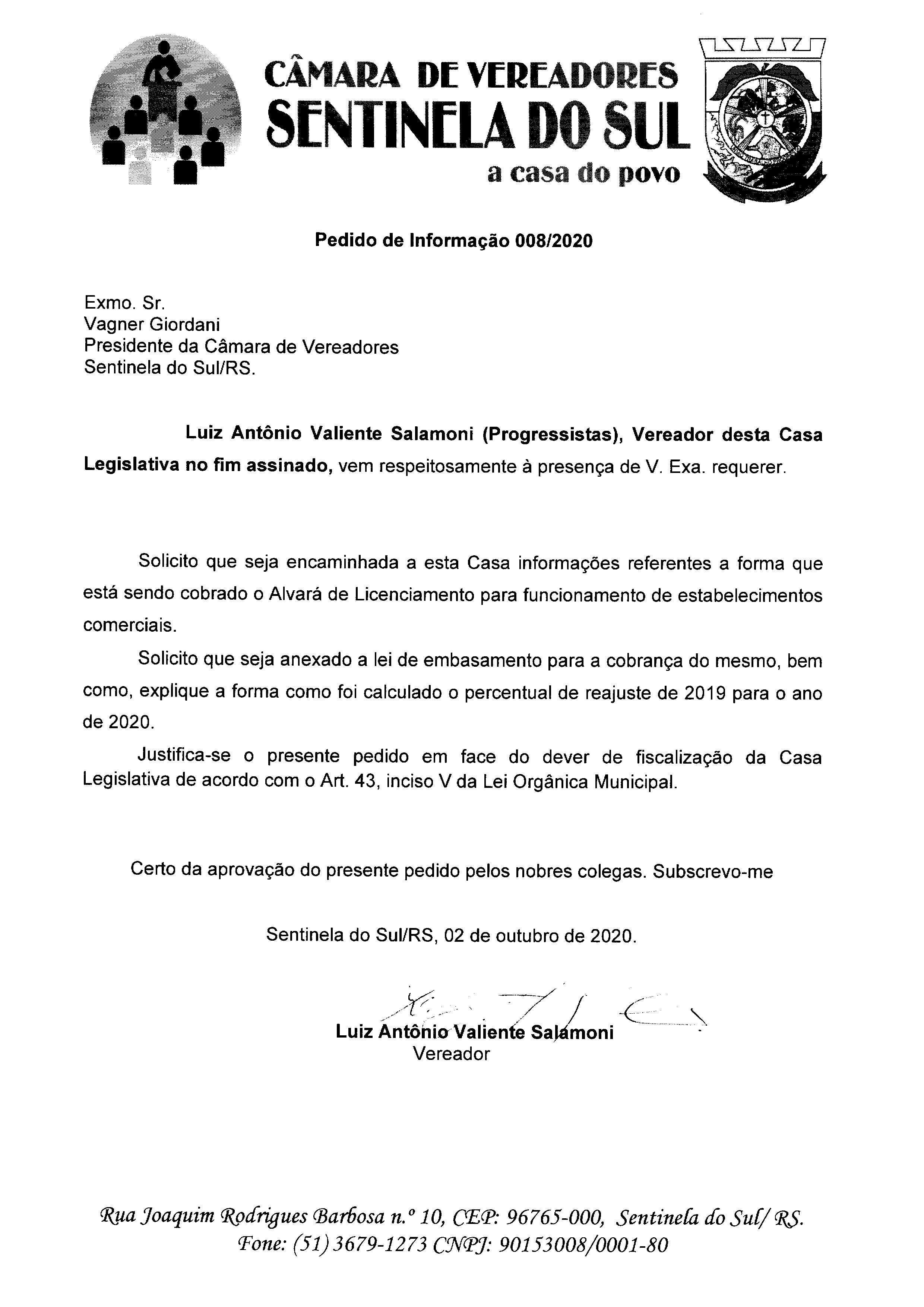 Pedido de Informação de autoria do Vereador Luiz Antonio Valiente Salamoni.