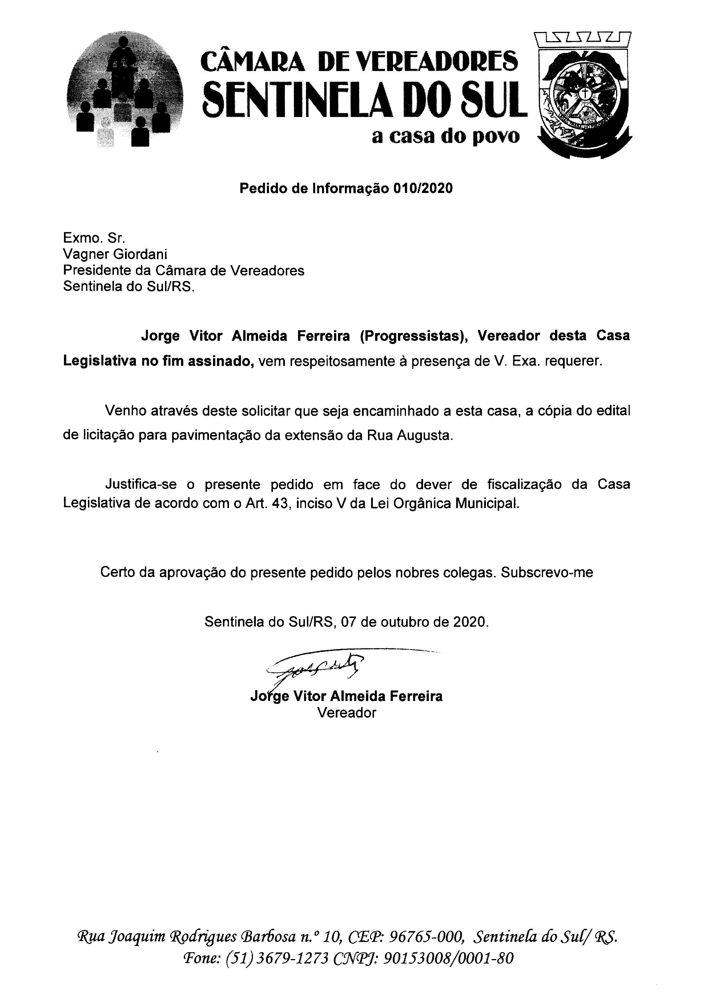 PEDIDO DE INFORMAÇÃO Nº 010/2020
