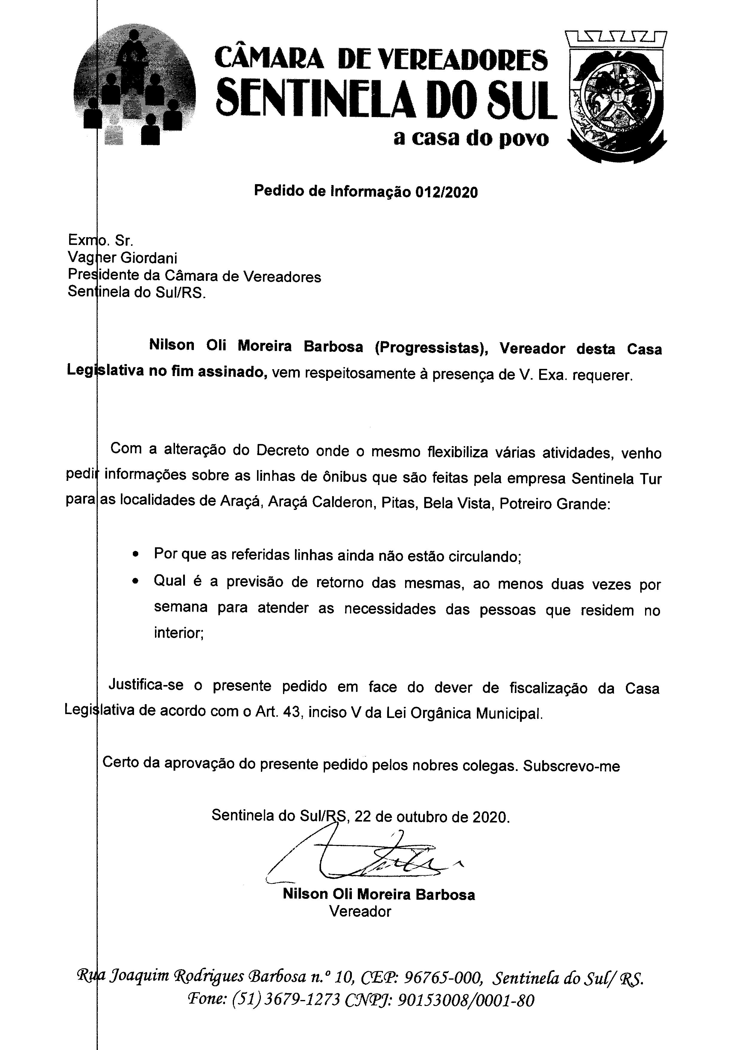 PEDIDO DE INFORMAÇÃO Nº 012/2020