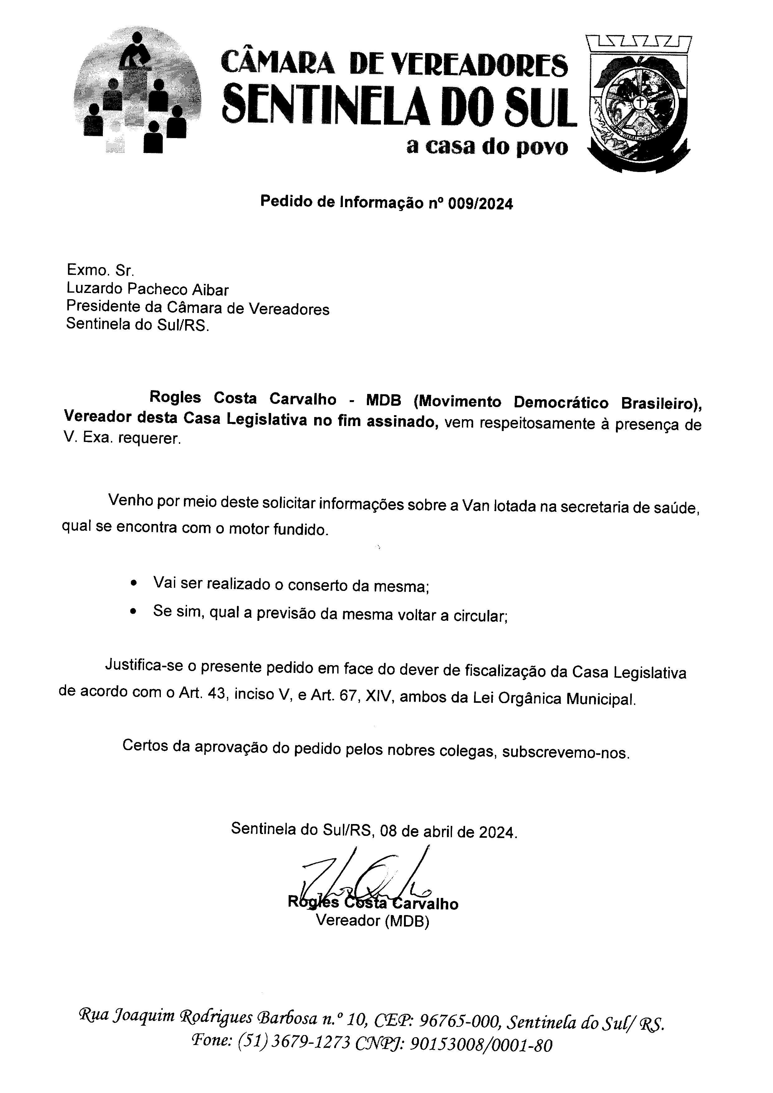 Pedido de Informação de autoria do Vereador Rogles Costa Carvalho