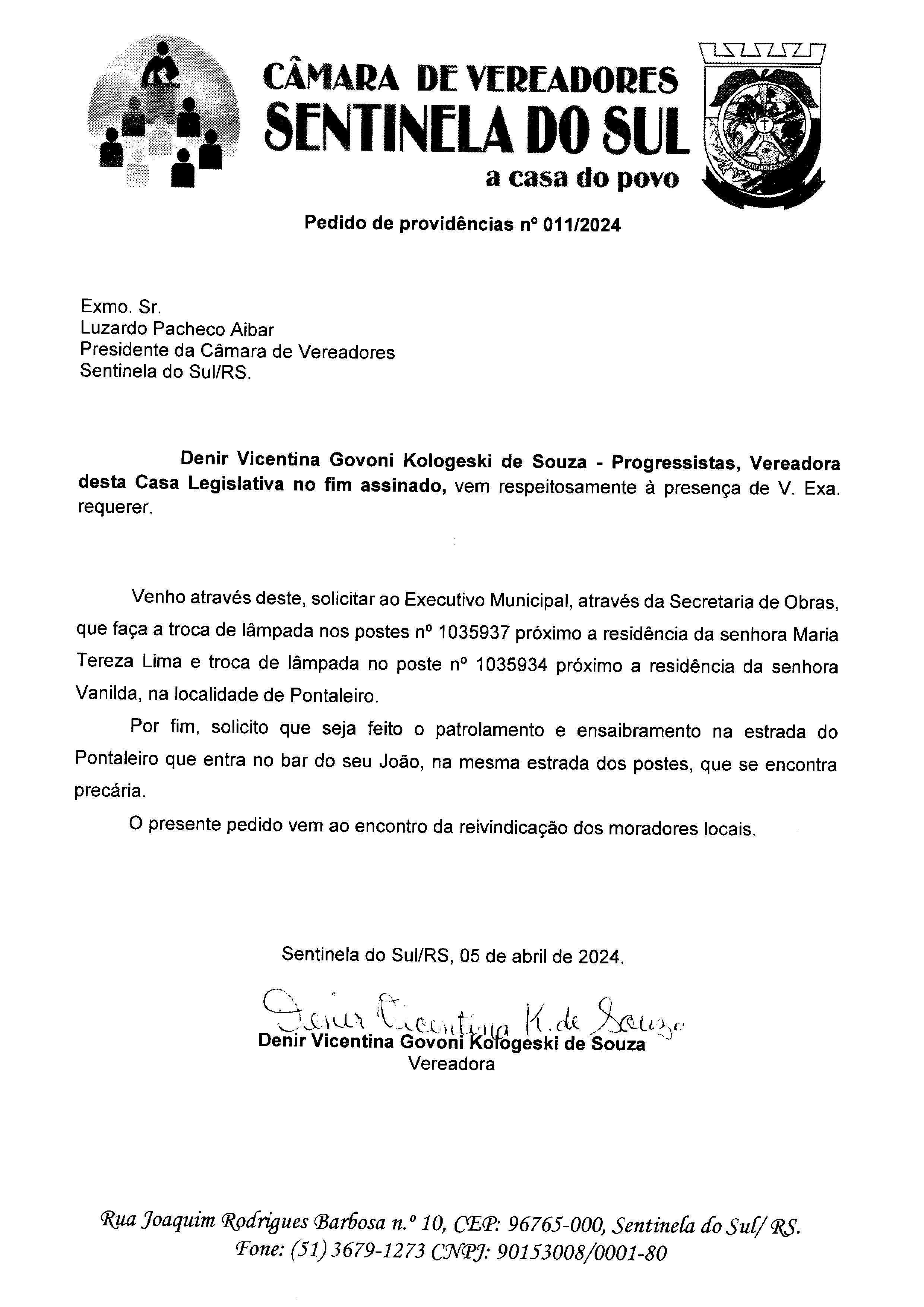 Pedido de Providências de autoria da vereadora Denir Vicentina Govoni Kologeski de Souza