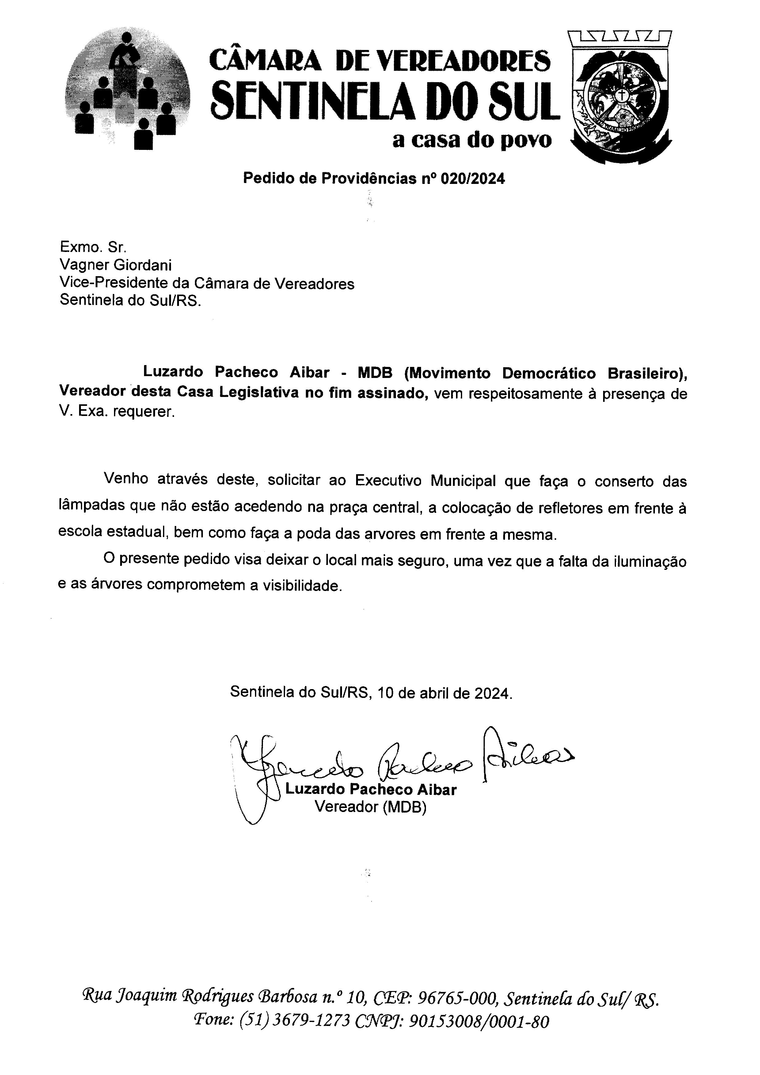 Pedido de Providências de autoria do vereador Luzardo Pacheco Aibar