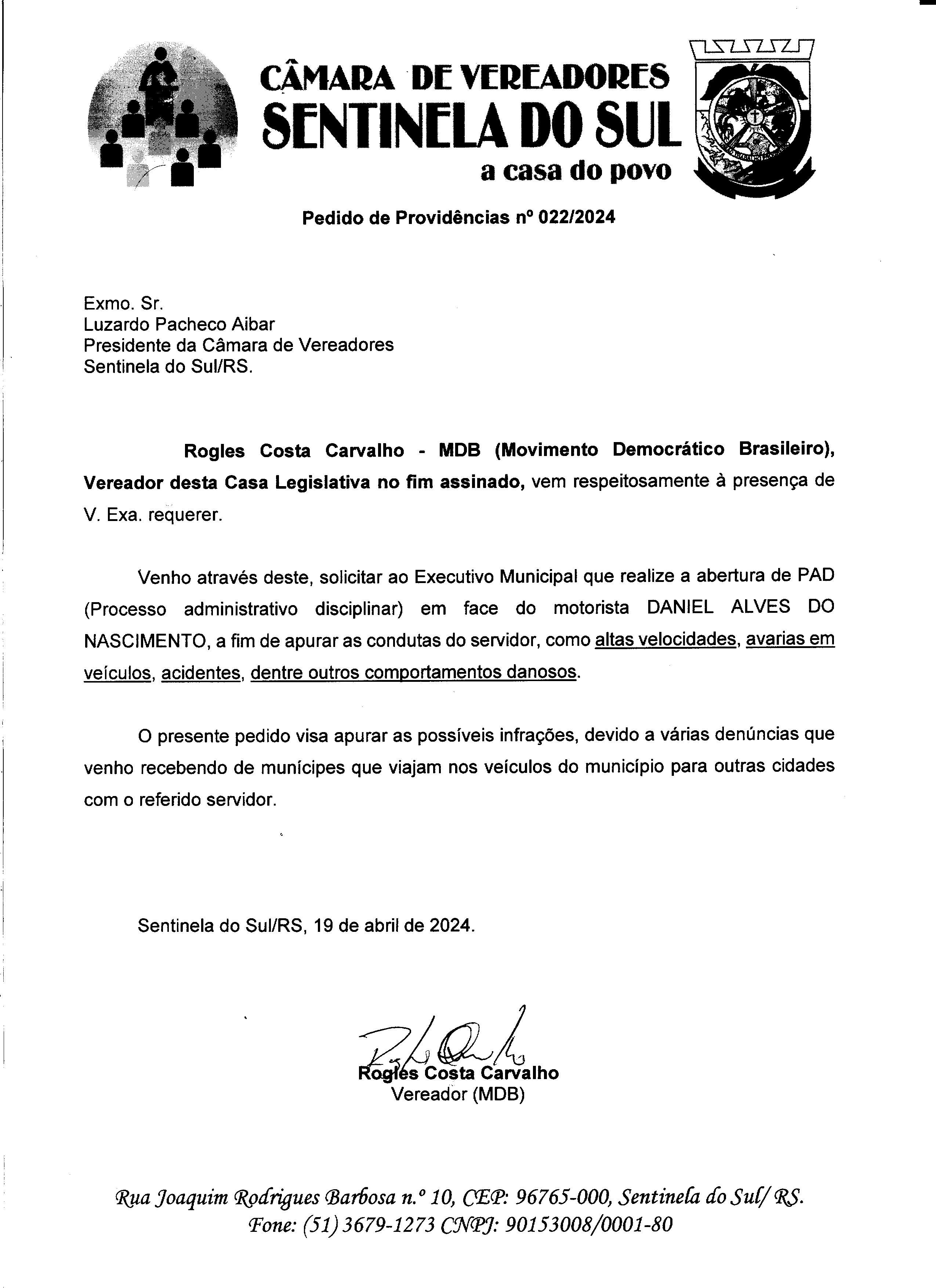 Pedido de Providências de autoria do vereador Rogles Costa Carvalho