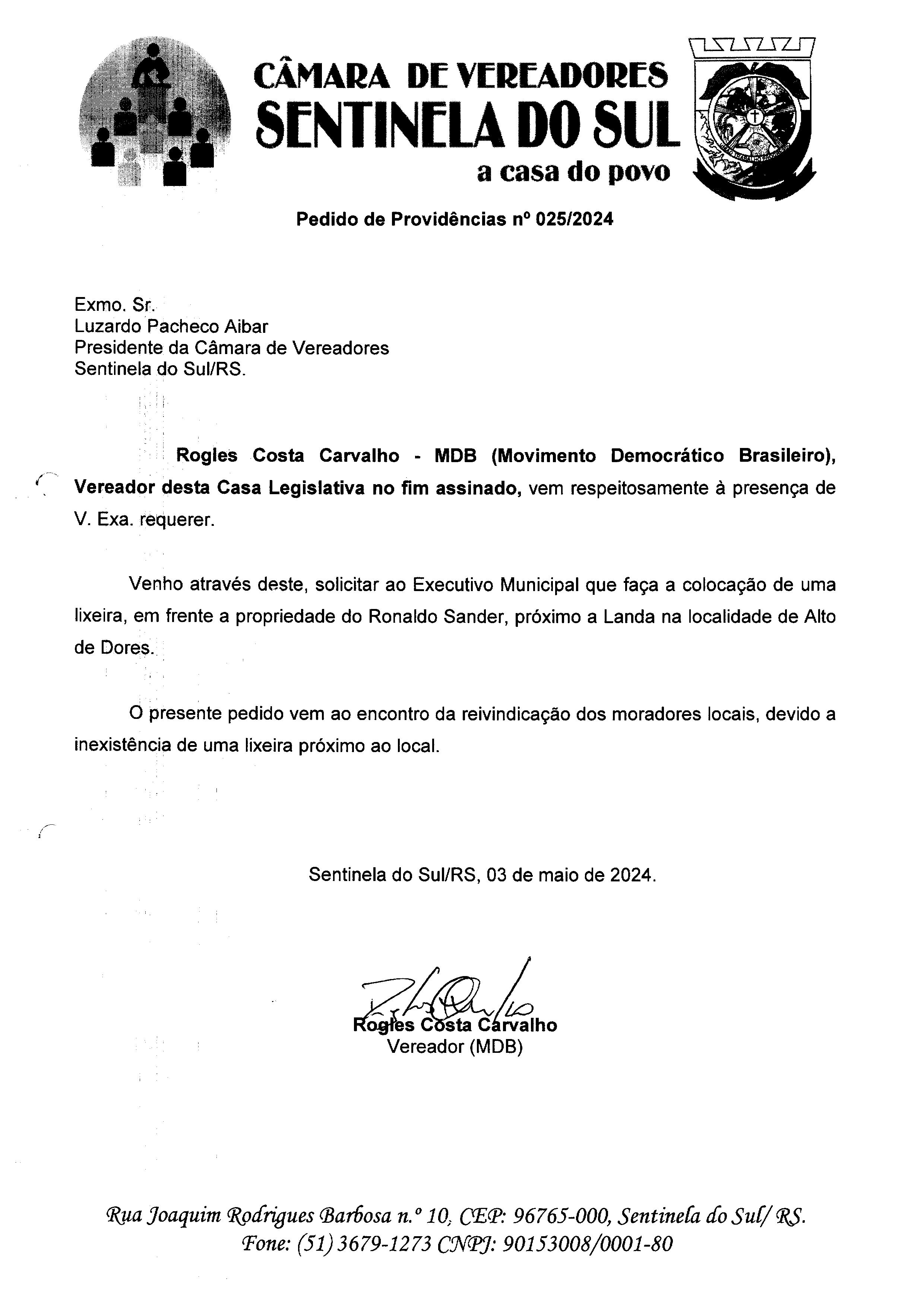 Pedido de Providências de autoria do Vereador Rogles Costa Carvalho