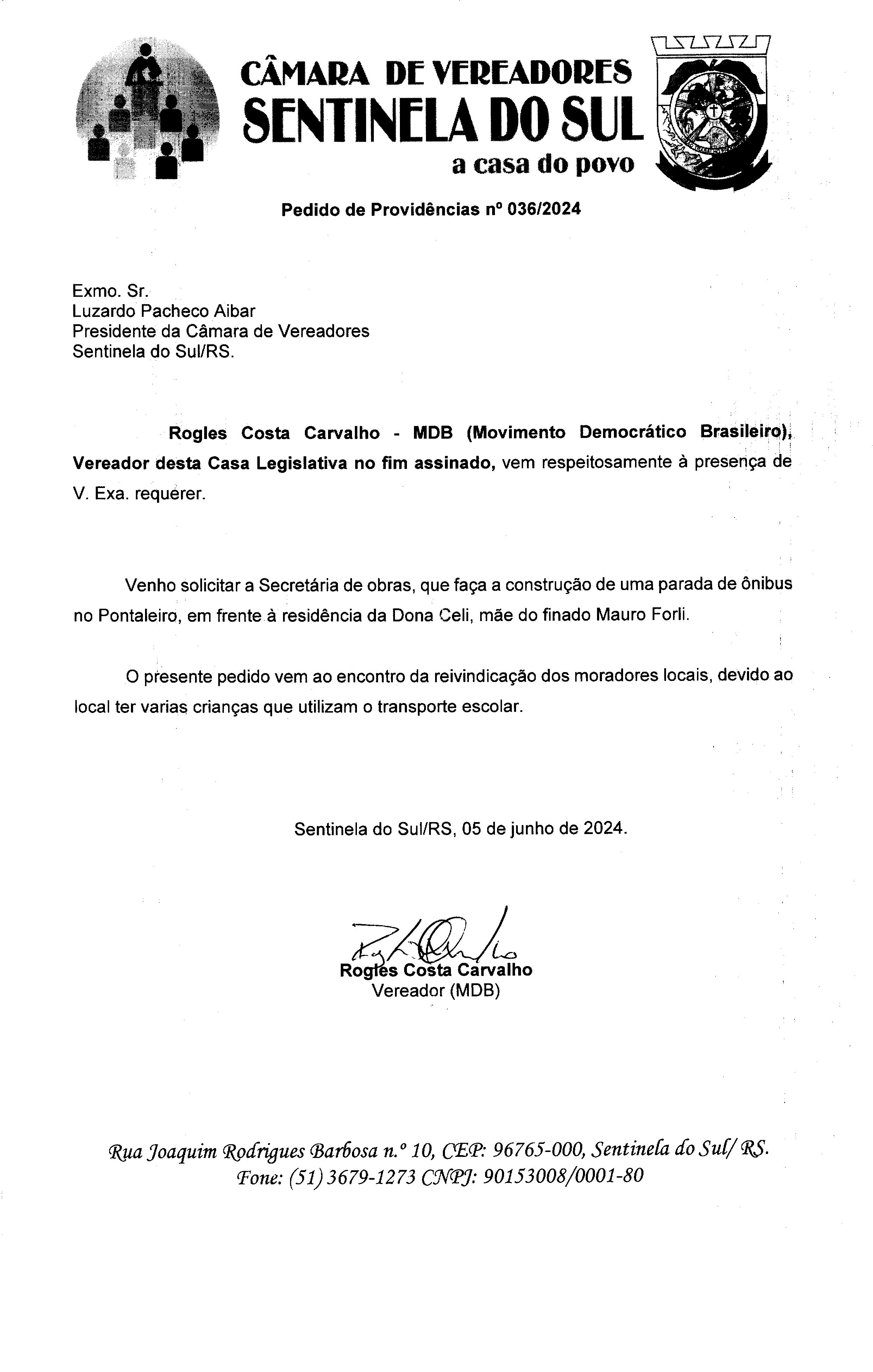Pedido de Providências de autoria do Vereador Rogles Costa Carvalho