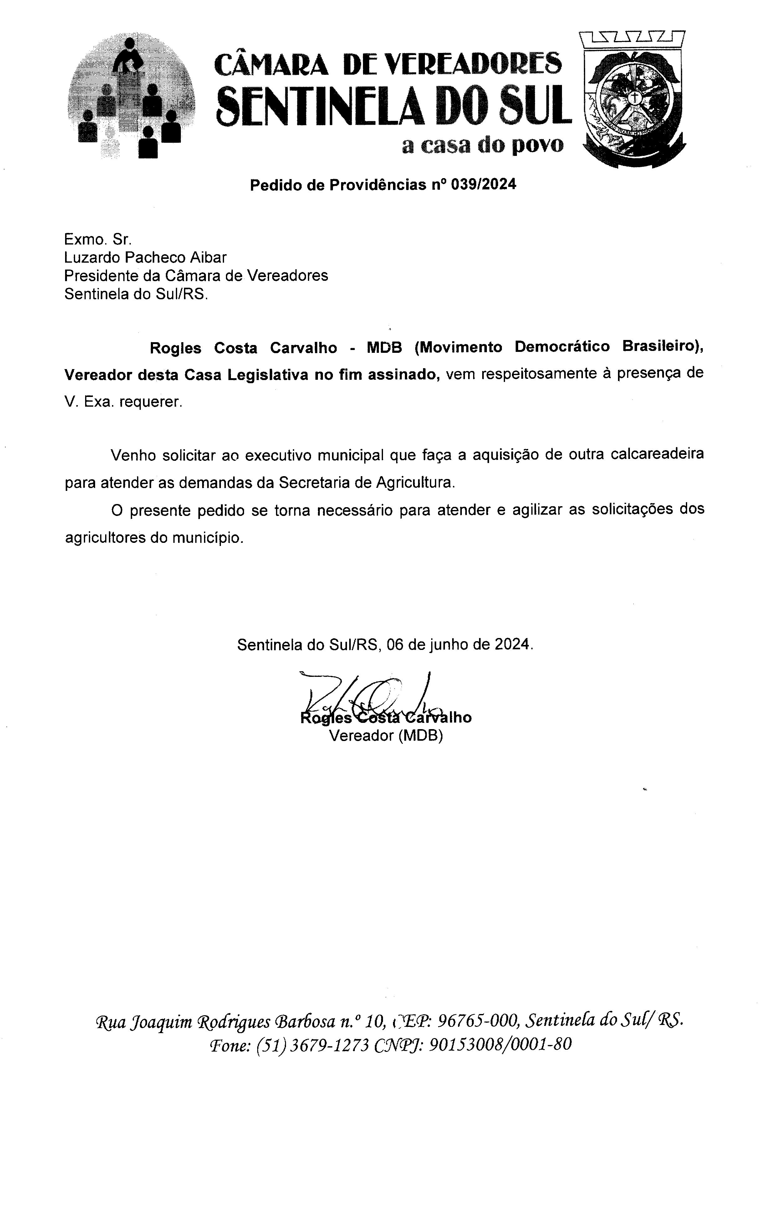 Pedido de Providências de autoria do Vereador Rogles Costa Carvalho